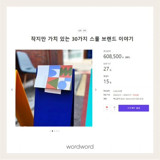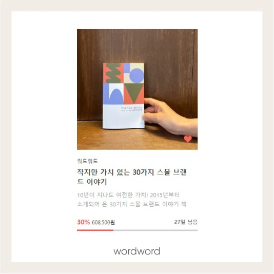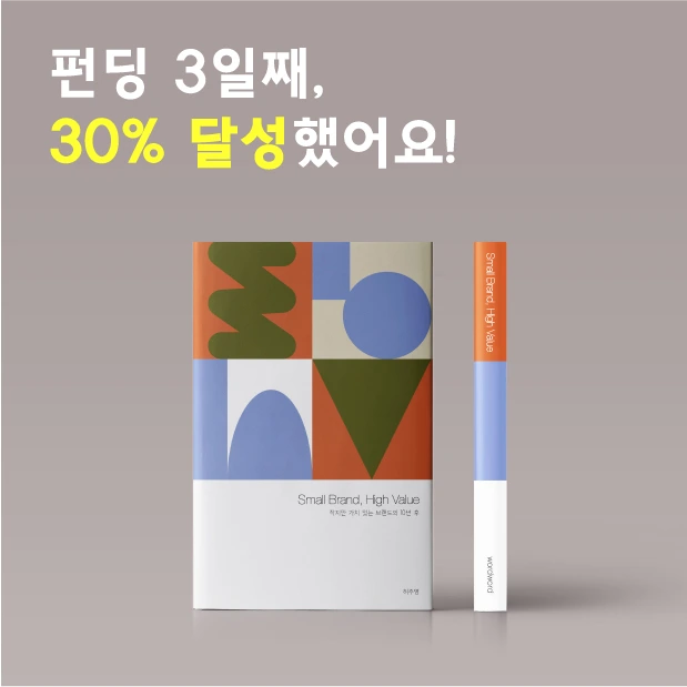 지난주 금요일, 21일에 시작된 ‘Small Brand, High Value – 작지만 가치 있는 브랜드의 10년 후’ 도서 펀딩이 3일째 맞이한 오늘 30%를 달성했습니다!