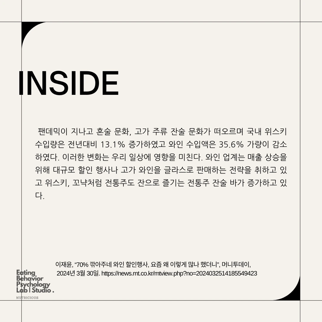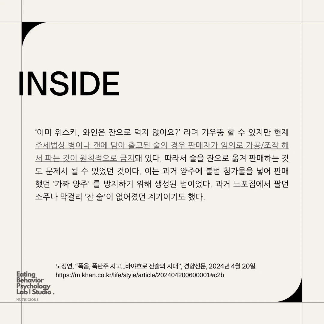 지난 3월 20일 기획재정부에서 주류 면허 등에 관한 법률 시행형 일부개정령안을 입법예고 하였습니다. 이로 인해 주종 불문 ’ 잔술 문화‘가 곧 가능해질 예정인데요. 현재 우리를 둘러싼 주류 환경은 어떻게 변하고 있고, 우린 어떤 것을 고려하며 환경을 맞이하면 좋을지에 대해 다루어 보았습니다.