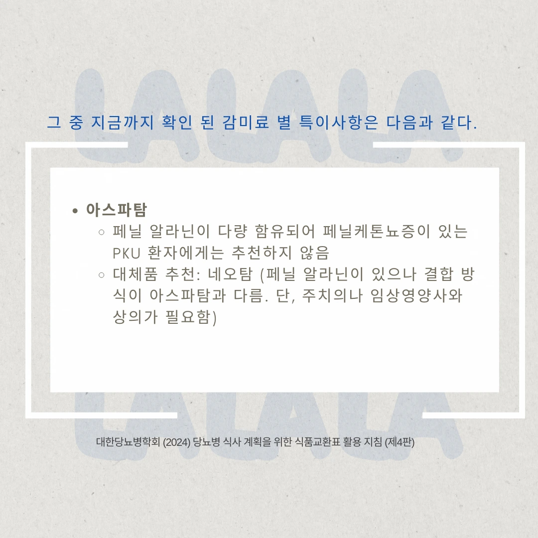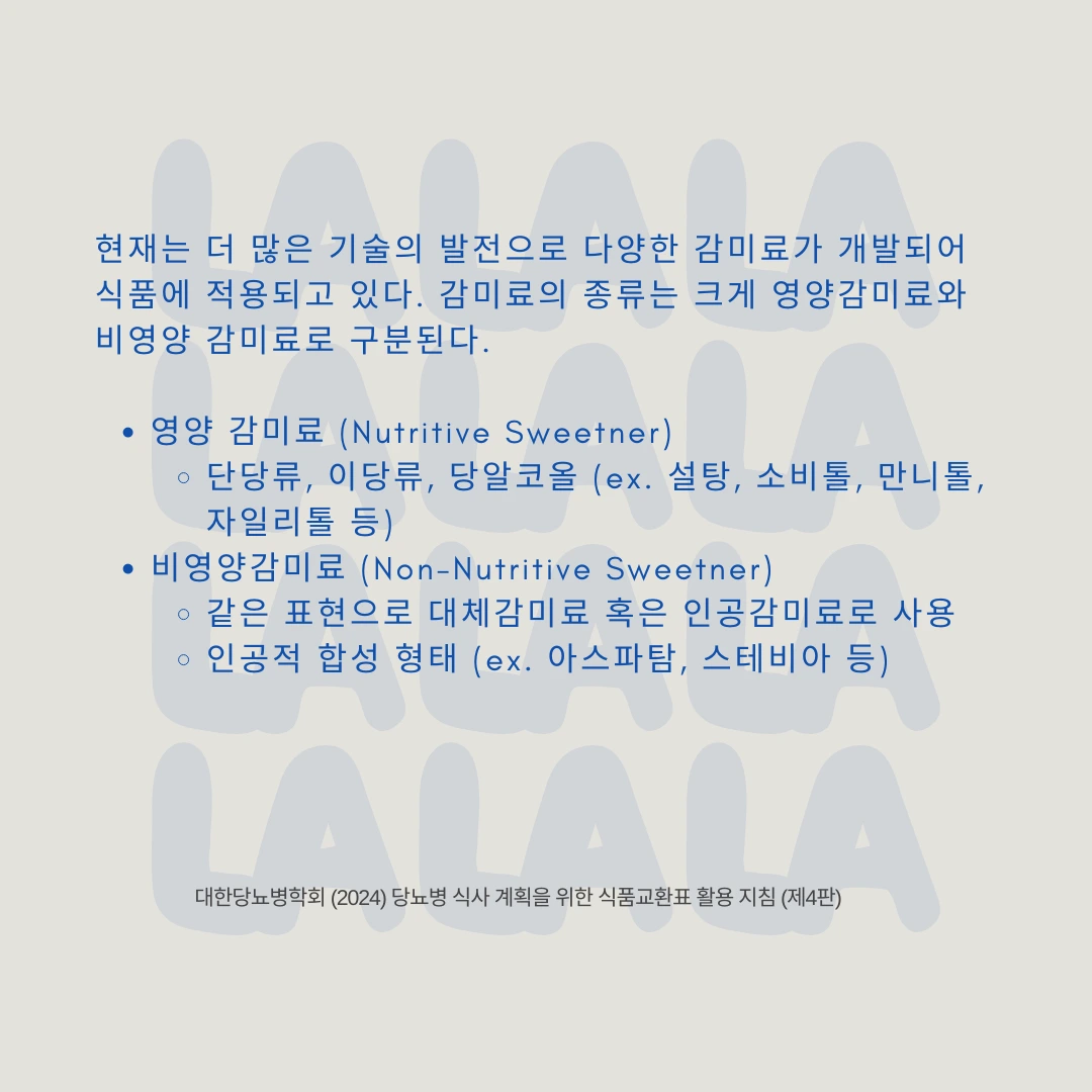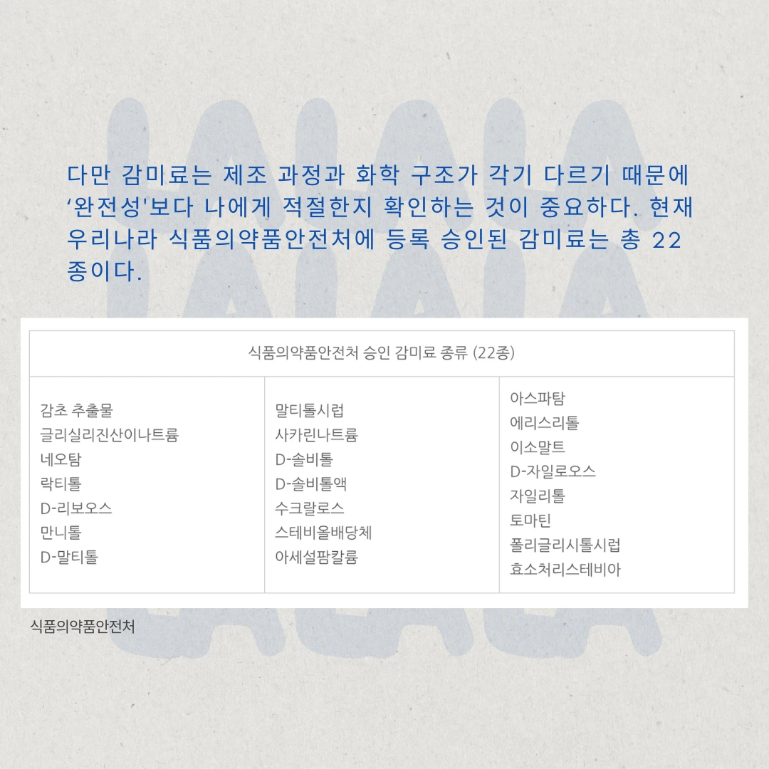 현재까지 총 22가지 종류의 감미료가 식품의약안전처에 등록되었는데요. 보다 자세한 ‘감미료’에 대한 내용을 확인해보시고 선택해보세요