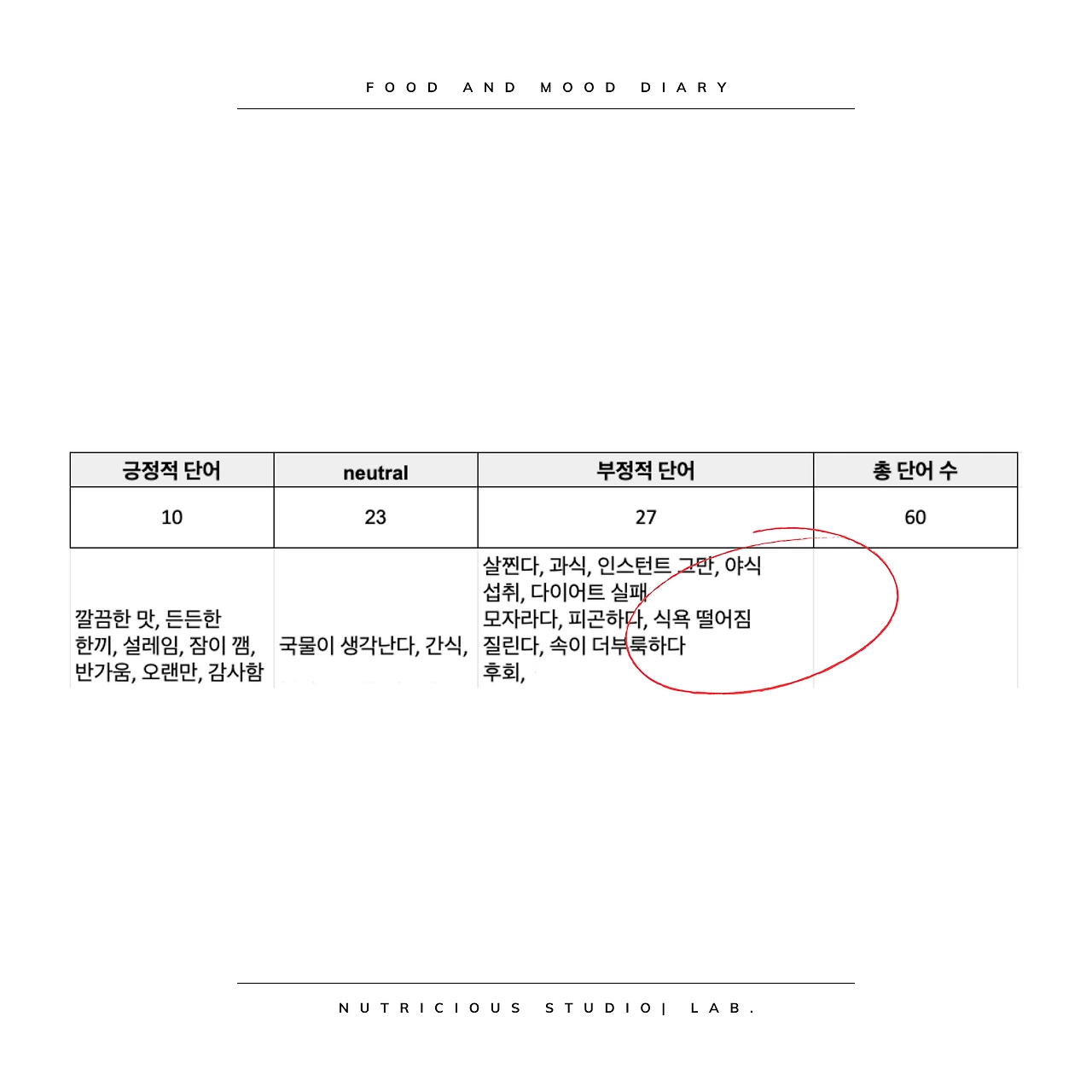 단어에 ‘긍정(동그라미) , 부정(세모) , 중립(네모) ’ 표시를 한 다음 각 단어가 주로 나온 음식, 상황, 감정을 보면 그동안 내가 몰랐던 음식 환경 속 내 반응을 확인하실 수 있어요. 때로는 음식이 내 감정을 알려주기도 한답니다