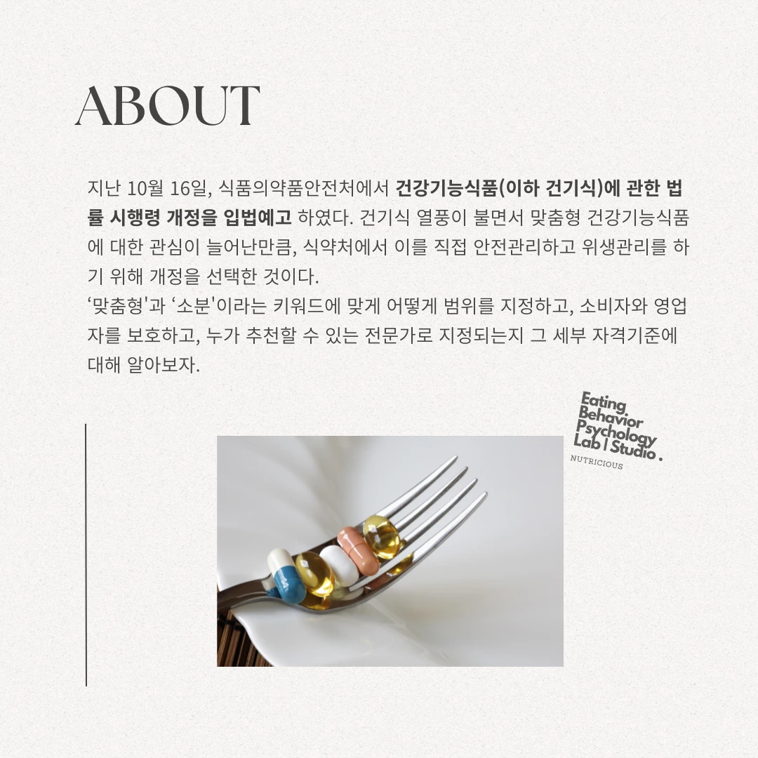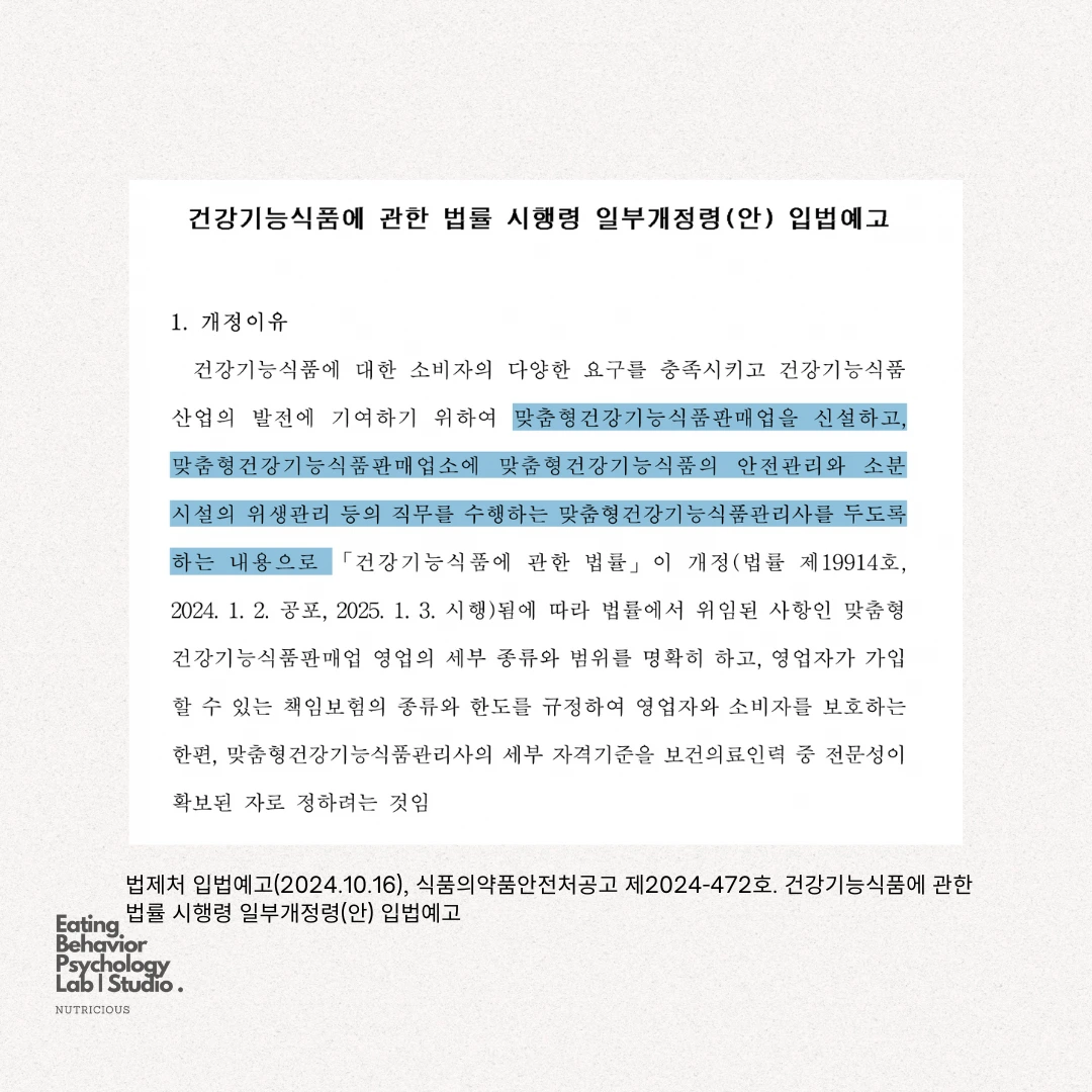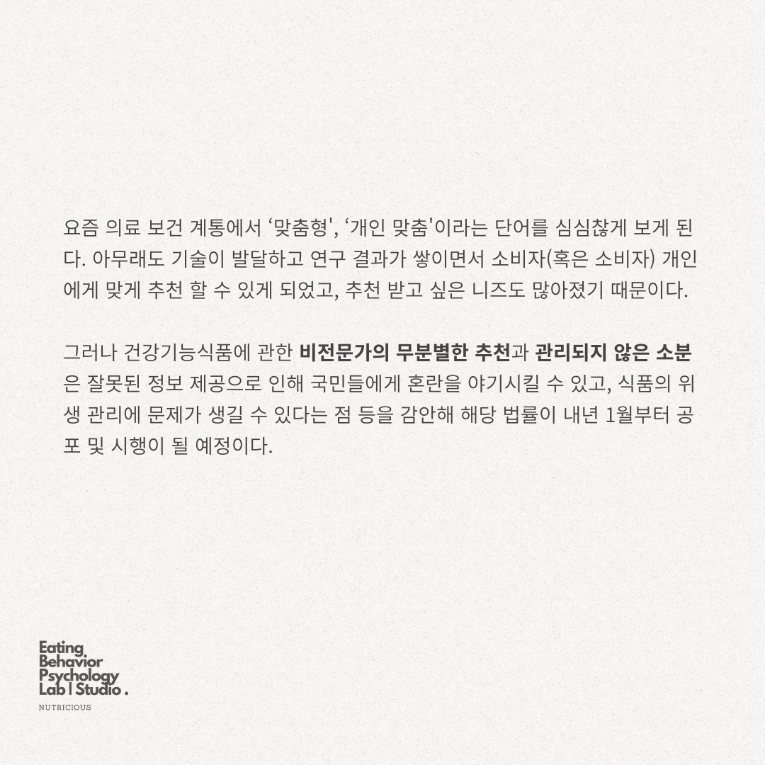그런데 내년이 되면 더 뜨거워지지 않을까 생각해 봅니다. 그 이유는 맞춤형 건강기능식품 판매에 대한 법령이 개정되기 때문인데요. 이번 INSIDE FOOD에서는 맞춤형 건강기능식품 관련 개정될 법령은 어떤 내용인지, 앞으로 어떤 변화가 나타날지 등에 대해 다루어 보았습니다.