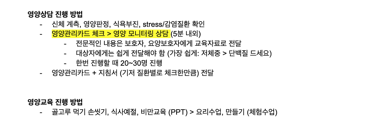 그런데 사회복지급식관리지원센터에 해당되는 대상자인 '노인', '장애인'의 식사를 교육, 관리, 상담한다는 것이 단순하게 생각해도 할 일이 엄청 많게 느껴지지 않는가? 인간은 나이가 들수록 동년배 간의 건강에 따른 인지 수준 스펙트럼이 천차만별로 넓어진다. 요양병원에 있는 사람과 경로당에 있는 사람은 같은 나이라도 완전히 다른 접근을 해야 한다. 특히 치매여부에 따라 삶의 질이 크게 차이 난다. 질병도 하나만 보유한 사람을 찾기 힘들다. 그러니 대상자의 특성에 따른 대처와 세그먼테이션 별 접근이 매우 중요하다. 장애도 어떤 장애인지, 등급에 따라 어느 수준으로 소통할 수 있는지, 그들의 보호자가 말하는 '식사 문제'가 단순히 '영양소'로 이야기할 수 있는지 등. 고려하다 보면 사회복지급식관리지원센터가 해야 할 일은 아주 어려운 일이다. 그래서 참조하는 pdf 들을 보면 기본 150 ~ 200 페이지가 넘고 선생님 1명 당 20~50개의 업소를 맡아서 주기적으로 점검을 하고, 배포 자료를 만들고 교육, 상담을 해야 한다.