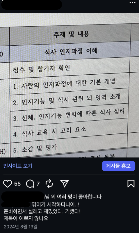 그 정도까진 아니지만 뉴트리셔스의 여정을 돌이켜보면 '1기', '첫 시도'가 많았던 것 같다. 첫 시도는 섭외를 하는 담당자분도 잘 해내야 되는 입장이고, 의뢰받는 입장에서도 잘해야 다음이 있기에 부담도 기대도 항상 뒤섞여 있다. 하지만 그 어떤 강의 요청보다 기뻤다. 그 이유는 내가 전공했던 임상영양학과 인지심리학을 모두 고려해서 실제 현장에 기여할 수 있는 내용으로 많은 영양사 선생님들께 소개하고, 또 실제 현장에 기여할 수 있을 것 같다는 생각이 들어서였다. 그 강의 제목이 '식사 인지 과정의 이해'였다.