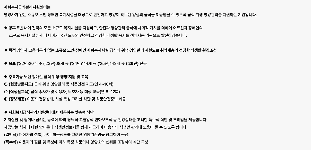 아이를 키우는 분들은 아시겠지만 유치원, 어린이집의 급식 관리를 담당하는 센터가 있다. 어린이급식관리지원센터라는 전국에 어린이급식관리지원센터가 설치되고 영양사가 없는 어린이 급식소등록이 의무화되어 모든 어린이가 안전하고 영양을 고루 갖춘 급식을 먹을 수 있도록 관리하는 곳을 말한다. 이 법이 제정된 것도 2008년이니 그리 오래되지 않았다. 그렇게 어린이의 급식을 관리하던 지원센터가 더 나아가서 영양사가 없는 소규모 노인·장애인 복지시설을 대상으로 안전하고 영양이 확보된 양질의 급식을 제공받을 수 있도록 급식 위생·영양관리를 지원하는 형태로 확장하는 곳들이 생겼다. 이를 사회복지급식관리지원센터라고 하고 함께 진행하는 곳도 있고 따로 진행하는 곳들도 있다.