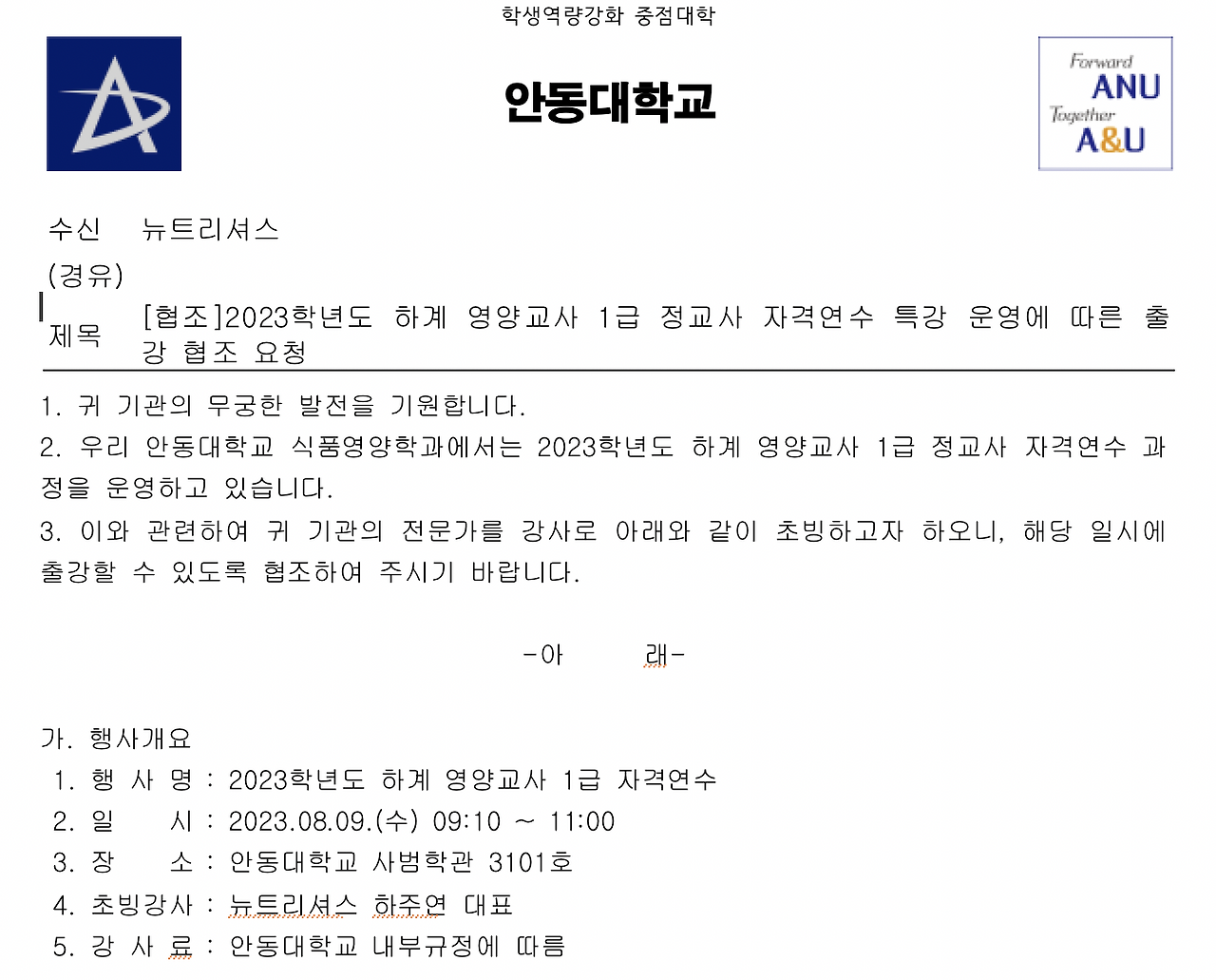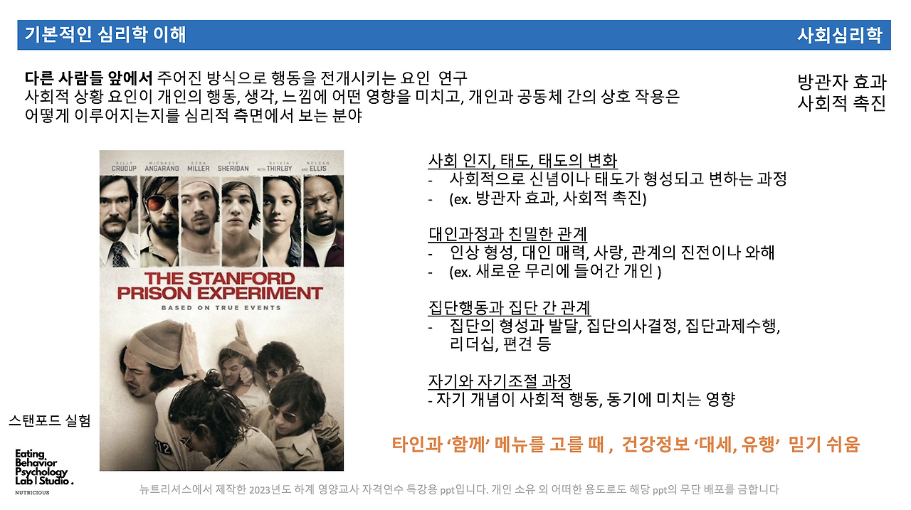영양교사 1급 정교사 자격 연수 특강 (2023) 식사심리와 뇌과학 - 대상자 : 영양교사 1급 자격 연수 해당자, 의뢰 : 안동대학교