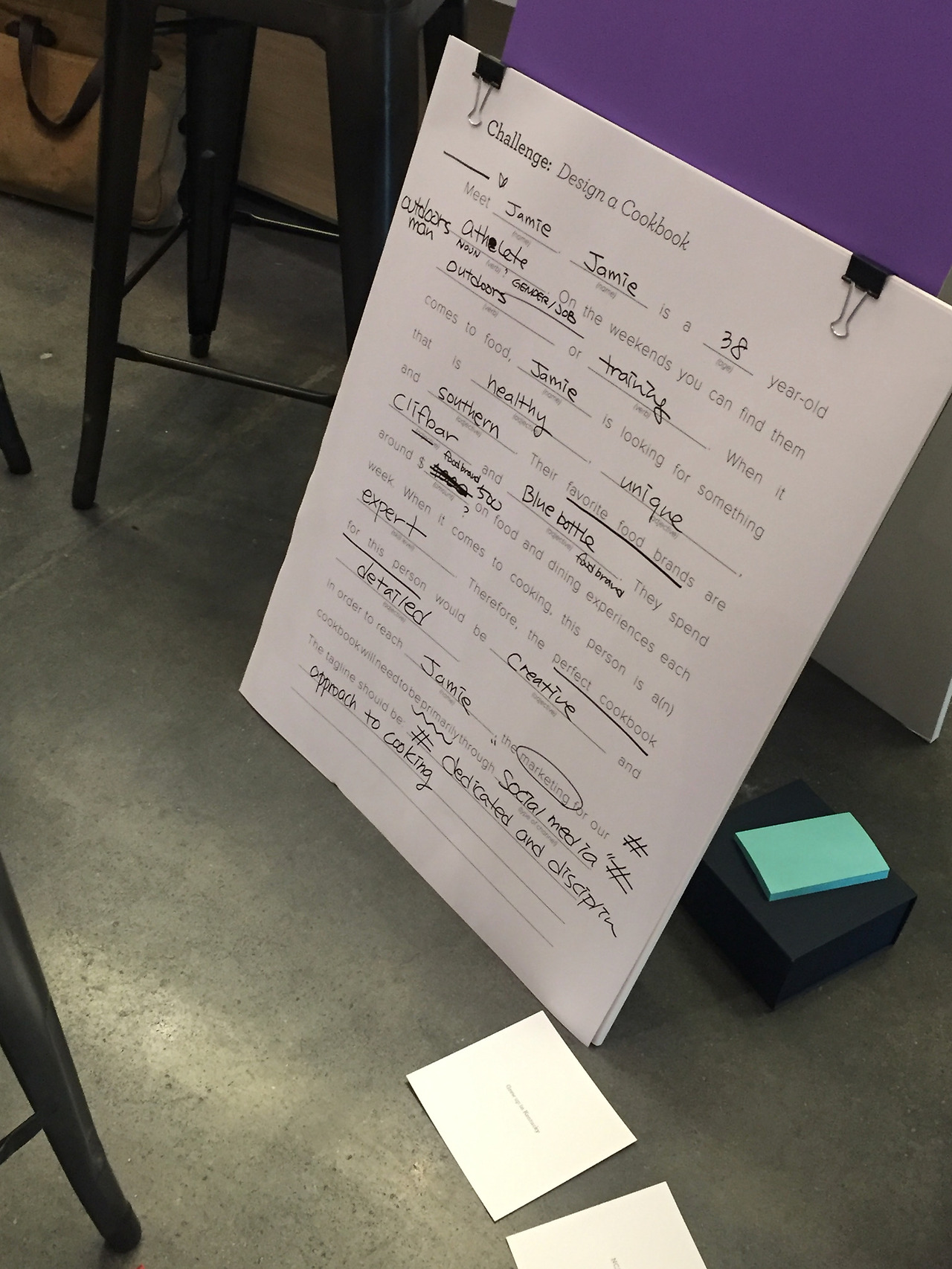 이 워크숍의 목표는 아래 사진처럼 특정 퍼소나(고객 혹은 대상자)의 정보를 IDEO 팀원들이 나눠주면 그 사람에 대한 정보를 더 구체적으로 상상해서 단 한 명을 위한 요리책을 만드는 것이다.