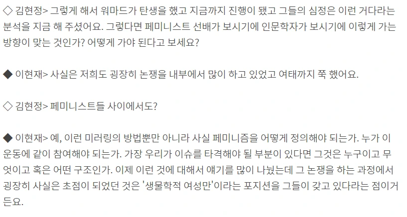 2) 토론 포맷으로 갈 것인가 - 그러려면 누군가는 워마드를 '논리적으로' 옹호해야 한다. 문제 있지만 의미도 있다, 이런 게 아니라 큰 방향에서 이쪽이 맞다는 수준은 돼야 한다. 누가 그걸 하지? 익명으로도 구하기 어려울 거다. 워마드에 글을 쓰는 당사자들은 인터뷰를 하지 않는다. 혹여 탈탈 털어서 인터뷰할 당사자를 구했다쳐도, 굳이 혐오세력에게 정색하고 마이크를 줄 이유는 없다는 문제가 남는다.