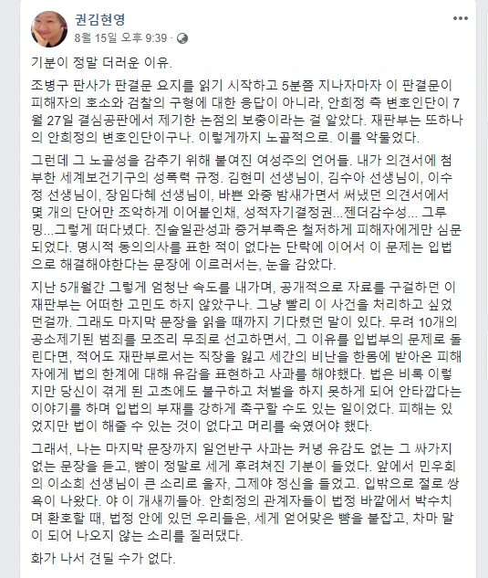 또 한 가지, 판결문을 읽어보면 법원이 그래도 고민을 많이 했다는 티가 난다는 이야기도 들었는데, 그 부분은 나도 동의한다. 다만 법원은 성적자기결정권이 무엇인지, 그리고 위력이 존재하는 상황에서 약자의 심정이나 행동패턴에 공감하기 위해 고민한 게 아니라 어떻게 하면 법원이 욕을 안 먹을 수 있을지를 열심히 고민했던 것처럼 보인다. 그러지 않고서야 성적자기결정권을 왜곡하고 입법부에 책임을 떠넘기는 판결문을 쓸 수가 없다.