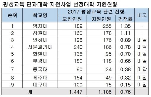 이화여대 사태로 전국민의 관심사가 되어버린 평생교육단과대학 역시 큰 틀에서 보면 다르지 않다. 다만 평생학습중심대학이 기존의 학사구조를 유지한 상태에서 운영방식의 변화를 유도했던 것과는 달리, 평생교육단과대학은 말 그대로 단과대학을 통째로 신설하는 사업이다. 대학의 학사행정 전체를 뒤흔드는 일이기에 제도에 대한 충분한 연구와 도입하고자 하는 대학 내부 구성원들 사이에 오랜 시간의 토론이 필요했음에도 불구하고, 성급하게 추진된 것이 사실이다. 이화여대 사태의 여파가 있었다고는 하나, 평생교육단과대학 사업에 선정된 9개 대학은 2017년 수시모집 원서 집계 결과 0.76대 1의 경쟁률을 기록, 총 78개 학과 중 52개 학과의 지원자가 입학정원에 미달하는 사태가 벌어졌다.