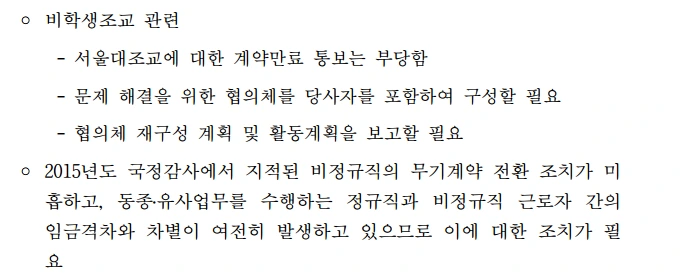 서울대는 감사원의 지적 이후에도 실질적으로 정규직과 같은 일을 하거나 사무실에 따라 더 중요한 일을 담당하기도 하는 비정규직 노동자의 업무를 ‘보조’로 규정함으로써 임금과 복지 등에서 차별을 두는 방안을 내놓았다. 정규직을 더 고용하는 것만이 근본적인 해결방안이지만, 그렇게 하면 인건비가 상승한다. 결국 비용절감을 위해 기형적인 고용 관행을 유지하고, 비학생 조교와 무기계약직들을 차별하고 있는 것이다.
