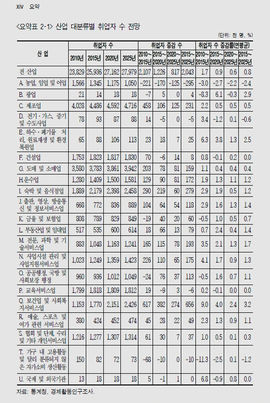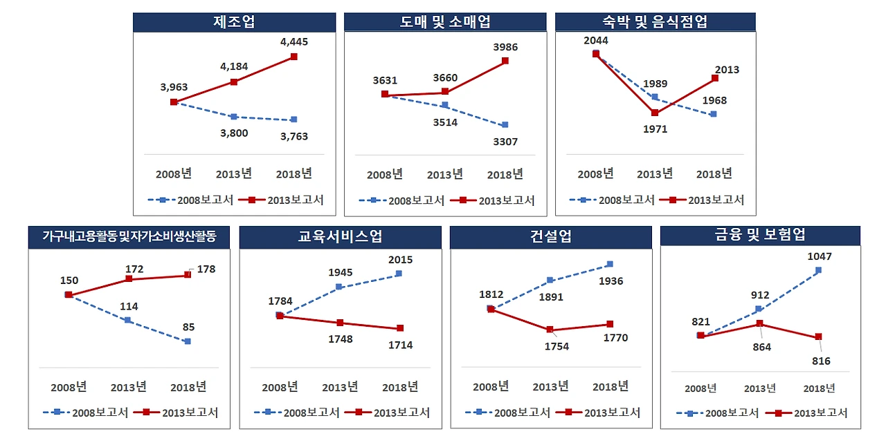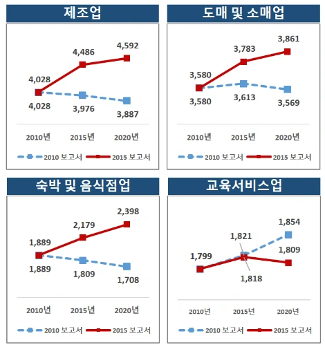 결과는 실망스러웠다. 2010년 보고서에서 향후 인력수요가 줄어들 것으로 예측한 제조업, 숙박 및 음식점업의 종사자 수는 2015년 실제 조사 자료에서 오히려 늘어났다. 도·소매업과 교육서비스업의 경우 두 보고서에서 2015년은 비슷한 방향을 보이지만 2020년의 전망이 달라진다. 업종 수는 적어도 이 4개 업종의 종사자 수는 약 1,220만 명으로 조사대상 노동자(약 2,500만 명)의 절반에 가깝다. 전망의 방향은 맞지만 증감율 등 구체적인 수치에서 큰 차이를 보이는 업종도 상당수 있다.