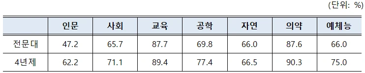 “현재 일자리에서 하고 계시는 일의 내용이 자신의 전공과 어느 정도 맞는다고 생각하는가?”라는 질문에 ‘보통’, ‘잘 맞음’, ‘매우 잘 맞음’으로 응답한 경우 전공일치 취업으로, 그렇지 않은 경우는 전공불일치 취업으로 간주하였음.