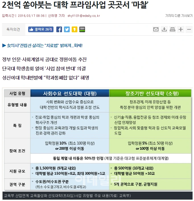 사회수요 맞춤형 교육은 박근혜 정부 교육부에서 일관되게 밀어붙인 대학구조개혁의 핵심기조 중 하나였다. 다만 대중적으로 그 내용이 알려지기 시작한 계기는 산업연계 교육활성화 선도 대학 사업(Program for Industrial needs-Matched Education), 즉 프라임(PRIME) 사업이었다. 프라임 사업은 신기술이나 융합 학문 중심으로 학과를 개편한 대학들을 선정해 2016년부터 3년간 총 6,000억 원을 지원하는 사업이다. 인구절벽시대를 맞아 교육부의 재정지원에 목이 마른 대학들은 사업 참여대학으로 선정되기 위해 학내의 갈등을 억지로 봉합하며 학과 구조조정을 단행했다.