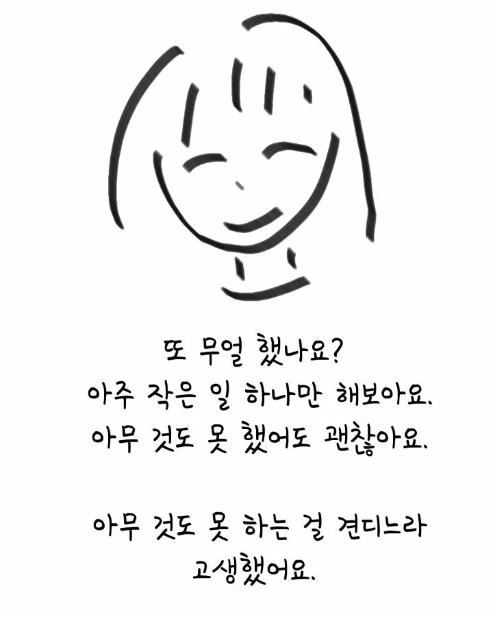 아무것도 못 할 때 우리는 자신을 자책하기 쉽습니다. 그러니 그 시간을 견디는 건 참으로 힘든 일이지요. 그래서 만든 문장이에요. 아무것도 못 할 때 이제부터 자책을 하지 말고 ‘내가 고생하고 있구나...’ 생각해주시면 좋을 듯 합니다. 자책은 채찍과 같아서 마음에 맞으면 무엇을 할 에너지를 오히려 없어지게 만들거든요.
