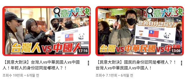 시민들의 답변은 흥미로운 점이 많다. 영상 기준으로 다수는 '대만인'을 선택했지만, '중화민국인'이라고 하는 사람도 적지 않으며, '중화민국인이자 대만인이다.'라고 하는 사람도 있다.