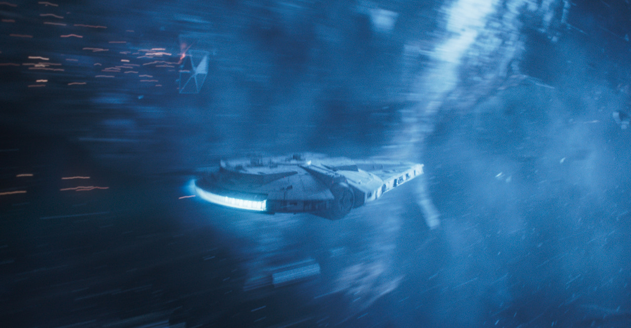 귀에 못이 박히게 들었던(!) 그 사건을 드디어 이 영화를 통해 만났다는 것. 그것만으로도 스타워즈 팬들에게 이 영화는 아주 의미가 크다고 생각합니다. 이 황홀한 미장센은 예전 <매드 맥스>에서 화면을 가득 메운 모래 폭풍 속을 질주하는 시퀀스를 떠올리게 했습니다. 압도적이었죠. 아주 짧은 씬이었지만 모든 소리를 배제하고 칠흑 같은 암흑 속 화면 하단에 아주 작게 밀레니엄 팔콘의 엔진 불꽃(?)만 보여준 씬은 정말 인상적이었습니다. 좀 다르긴 하지만 <라스트 제다이>에서 홀도 제독이 하이퍼 드라이브로 수프리머시(맞나요?)를 찢는 씬이 생각났습니다. 그 강렬한 미장센도 침묵 속에서 진행됐었죠(설정을 떠나서 그 장면은 미장센 하나만을 따지면 모든 스타워즈 시리즈를 통틀어 최고가 아닐까 합니다. 생각해보면 <라스트 제다이>는 훌륭한 미장센이 가득한 영화였어요). 마치 매드 맥스에서 가솔린을 입으로 뿜는 것처럼 연료를 주입해 밀레니엄 팔콘이 부스터를 쓰고 하이퍼 드라이버 점프로 사라지는 시퀀스의 끝은 정말 짜릿한 카타르시스를 선사했습니다(사실 하이퍼 드라이브로 기체가 사라지는 씬은 언제 봐도 짜릿함을 주지 않습니까ㅠ).