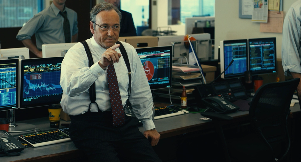 다시 영화 내적인 이야기를 하자면 이 영화의 내러티브 진행과 연출은 나쁘지 않습니다. 영화 끝까지 꽤 지루하지 않게 볼 수 있습니다. 하지만 이 영화의 큰 결함이 있으니 바로 캐릭터 구축입니다. 극을 이끌어가는 중요 캐릭터 중 한 명인 케빈 스페이시(리스크 관리 부서 총괄)의 캐릭터가 모호하게 그려집니다. 그는 극 초반 부서 직원의 대부분을 자르는 대량 해고를 하면서도 정작 자신의 아픈 개만을 걱정하는 냉혈한으로 그려지지만, 극 중반을 넘어가며 '시장 파괴'와 '거래처와의 신의'를 이야기하며 시장 교란을 주문하는 회장에 정면으로 부딪치는 도덕적인 인물로 묘사됩니다. 영화의 시나리오에서 캐릭터 변화character arc는 매우 중요한 요소이지만, 문제는 언제나 계기와 동기에 있습니다. 냉혈한이 도덕적인 인물로 변화하는 과정에 계기와 동기가 결여되어 있기에 관객은 그의 캐릭터에 혼란을 느낄 수밖에 없습니다.