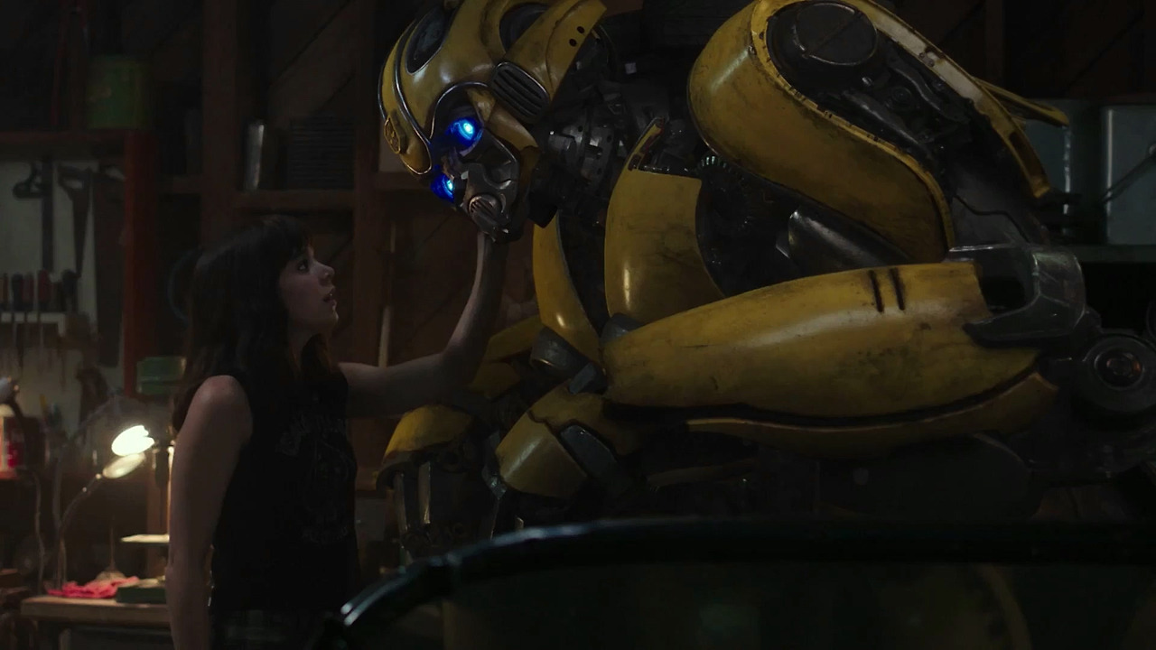 수없이 많은 영화들에서 반복됐던 이야기 공식입니다. 그중에서도 <범블비>는 <아이언 자이언트>와 <E.T.>의 이야기 구조와 아예 똑같습니다. 어떠한 플롯의 변주나 새로운 시도 없는 이 영화의 용기가 대담하다고까지 느껴졌습니다. 굳이 하나 다른 점을 뽑자면 외계에서 온 친구 캐릭터인 범블비를 다른 영화의 캐릭터들보다 더 애완견스럽게 연약하고 귀여운 존재로 묘사했다는 점 정도?