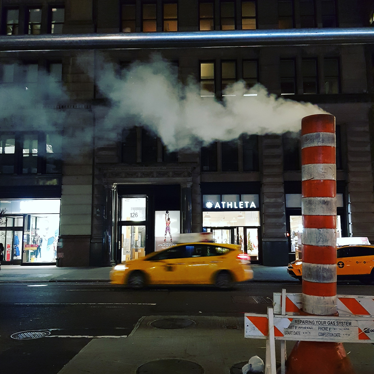 도로에서 뿜어져 나오는 하얀 김과 노란 택시가 아마 그 중 하나일 것입니다.