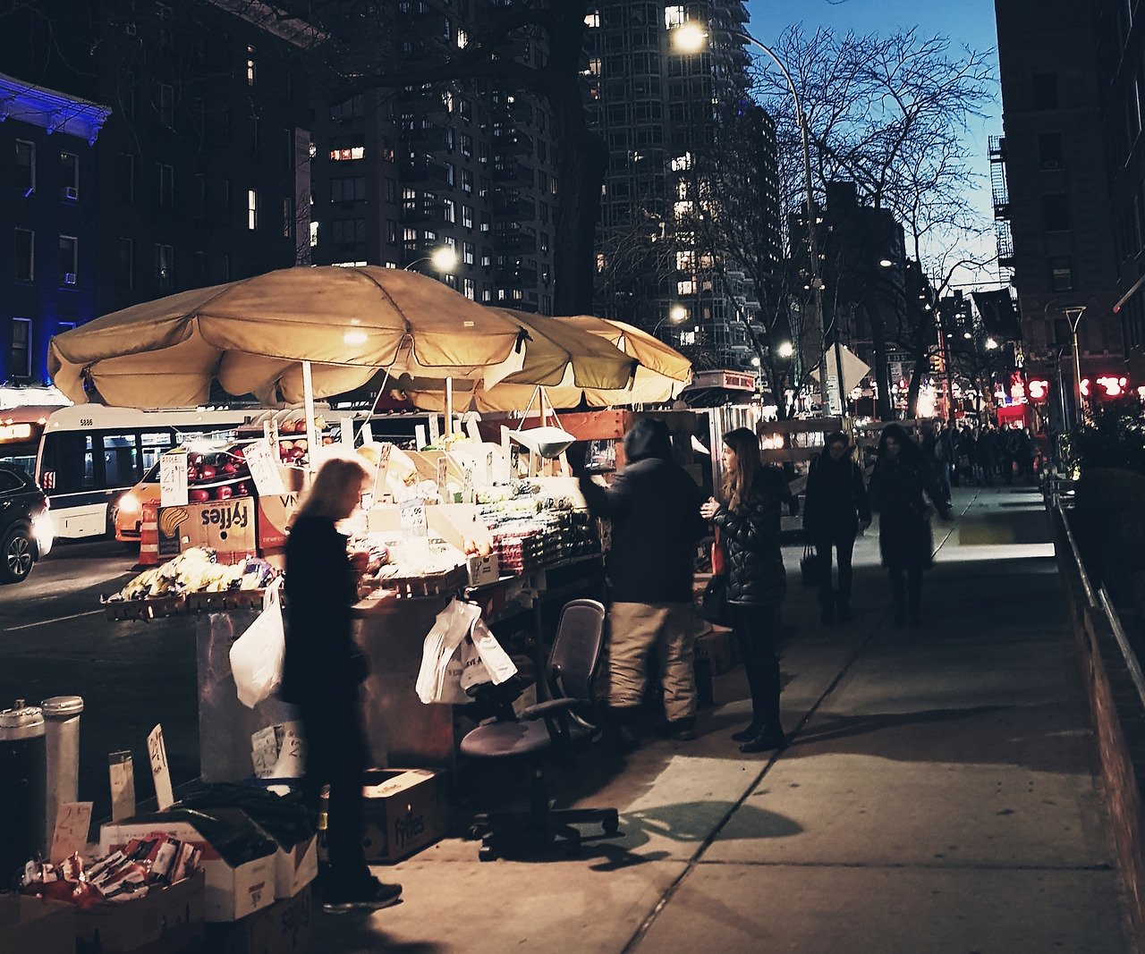 푸르스름하게 어두워지는 하늘, 과일을 파는 노점상에 켜진 노란 전구색 불,