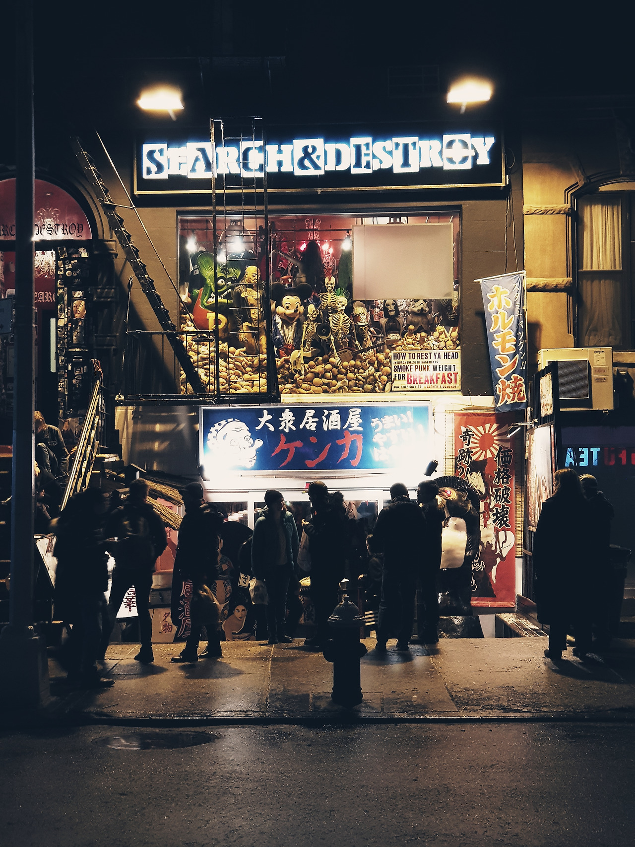 이스트 빌리지 East Village에는 일본 술집과 식당이 옹기종기 모여 있는 곳이 있습니다. 10년 전에는 이 동네를 '리틀 도쿄'라고 불렀던 것 같은데, 요즘은 그 말이 사라진 듯합니다. 아무튼, 그 동네에 위치한 사진 속의 저 가게는 제가 10년 전 뉴욕에서 어학연수를 할 당시 술 한 잔 하러 친구들과 종종 들르던 술집입니다. 예전 동네 목욕탕 타일에 그려져 있을 법한 우키요에 풍의 벽화에 옛 엔카가 구성지게 흘러나오던 저 술집에서 '에다마메'라는 것을 처음으로 먹어 보고, 공짜로 주던 작은 솜사탕도 오물오물거리던 기억이 생생합니다.