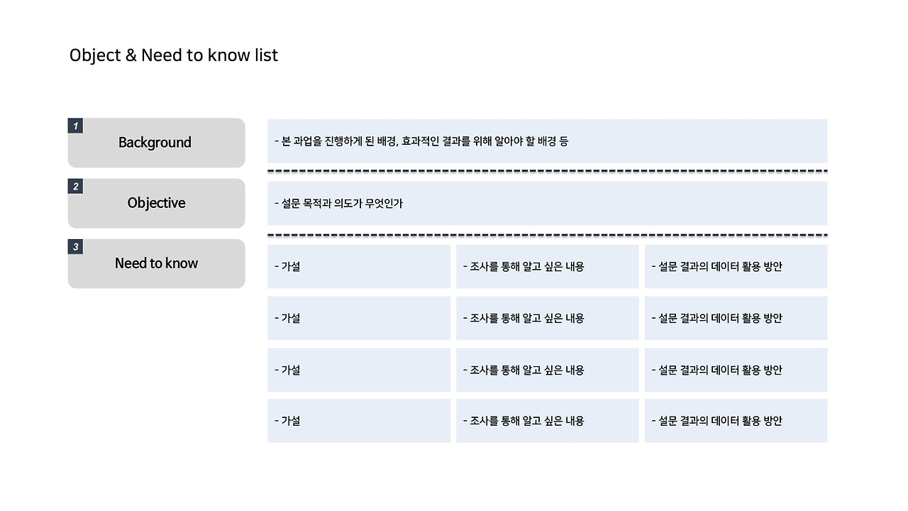 중요한 점은 조사 목적, 고객 정의, 경쟁사 정의다. 조사 목적, 가설수립, 가설 검증을 위한 조사항목, 개요가 당신 머릿속에 세팅되어 있어야 한다. 그렇지 않으면 결과가 무용지물이 되기 쉽다. 리서치를 처음 진행한다면 경험이 풍부한 리서치 회사의 도움을 받으며 개요와 조사문항을 짤 수도 있다. 하지만 모든 것을 리서치 회사에 맡겨서는 안된다. 가설 수립, 가설 검증을 위한 조사문항, 산업카테고리 특징, 경쟁사 정의 및 범위, 목표타깃 등은 당신이 직접 정의하고 결정해야 한다는 점은 잊지 말자. 리서치 경험이 부족하여 잘못된 조사목적, 경쟁사 선정, 리서치 설계 등이 제멋대로 된채 진행하는 경우를 종종 봤다. 그런 조사결과가 나오지 않도록 공부하고 고민해야 하는 것은 당신 몫이다.
