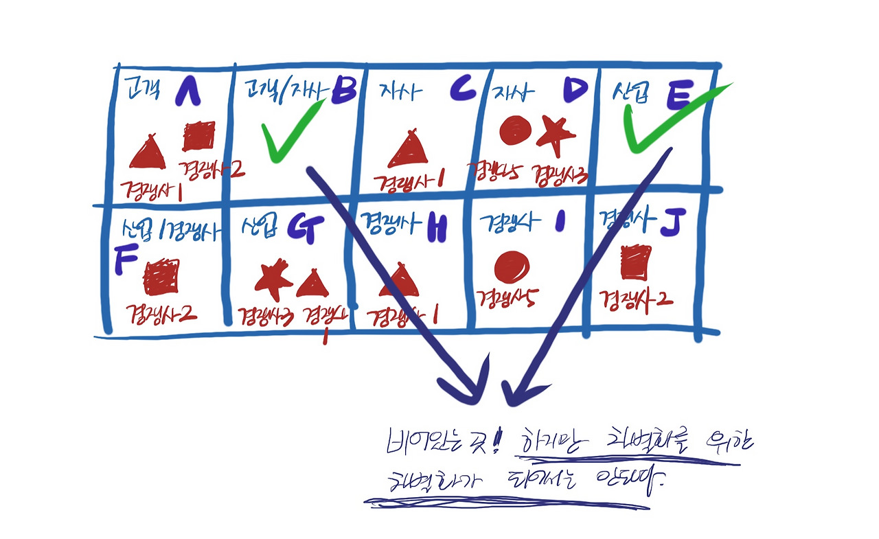 당신이 찾은 비어있는 공간에 당신 기업의 강점과 산업의 미래가치가 있는가? 그렇다면 가장 이상적인 방향성이라고 판단한다. 만약 비어있는 공간이 있어도 자사의 강점과 관련성이 없거나 산업, 고객의 가치와 관련성이 낮다면 잠시 보류한다.