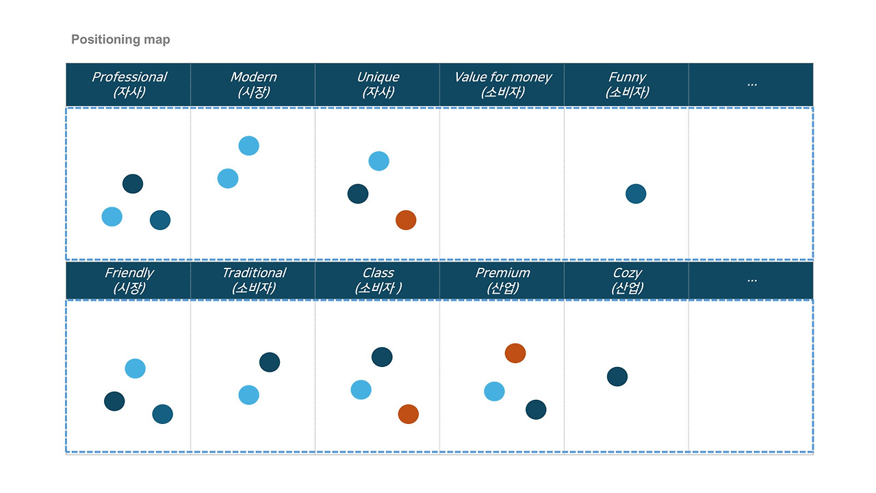 다음으로는 당신의 경쟁사가 현재 어떤 가치들을 언급하고 있는지 표시한다. 어떤 가치에는 하나만 있을 수도 있고, 어떤 경우에는 하나도 없을 수 있다. 혹은 2개, 3개 이상이 뭉쳐있을 수도 있다. 시장에서의 key players들이 무엇을 말하고 있는지를 살펴보자.