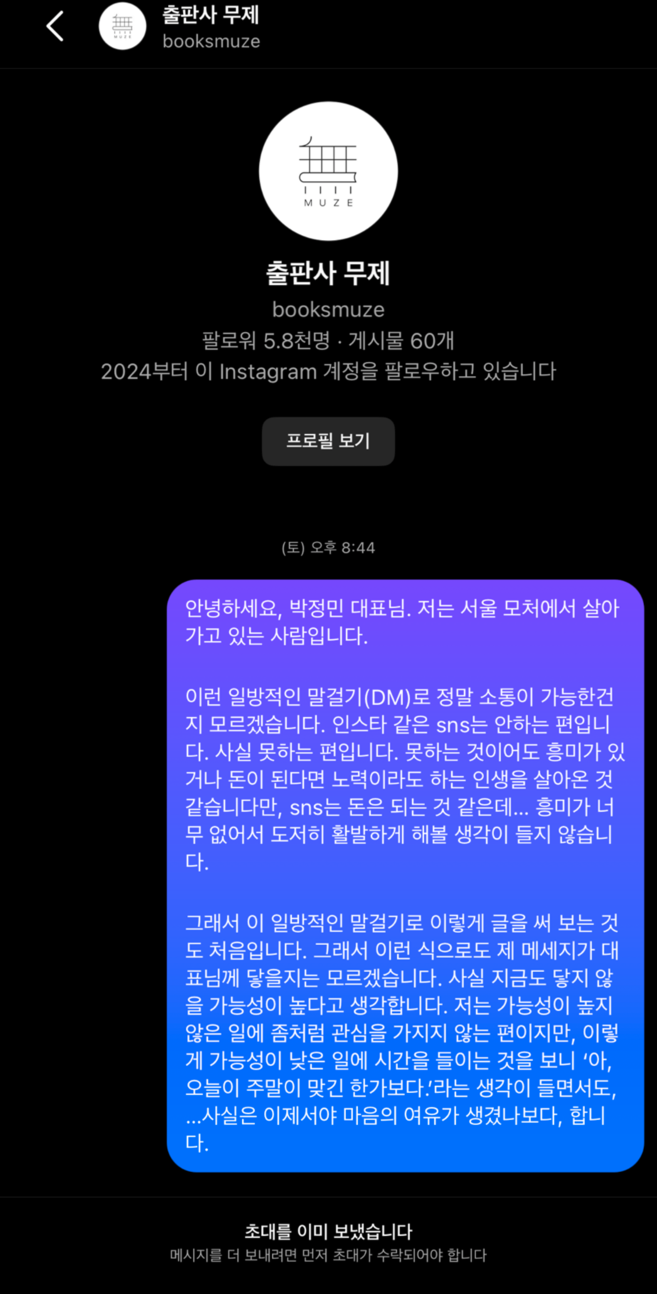 아마 지난주 토요일, 그렇다면 11월의 마지막 날이었다. 내 기억이 맞다면 그날 그 DM은 내 생애 최초의 DM이었다. 아파트 청약도 아니고 ‘생애 최초 DM’이라니. 게다가 생애 최초 특별공급이나 생애 최초 대출은 ‘생에 첫 시도’에 있어서 나름의 혜택을 주는 것인데, DM은 생애 최초로 보내든지 생애 마지막으로 보내든지(마지막이 꼭 죽음을 의미하는 것은 아니다) 혜택이랄 건 없었다.