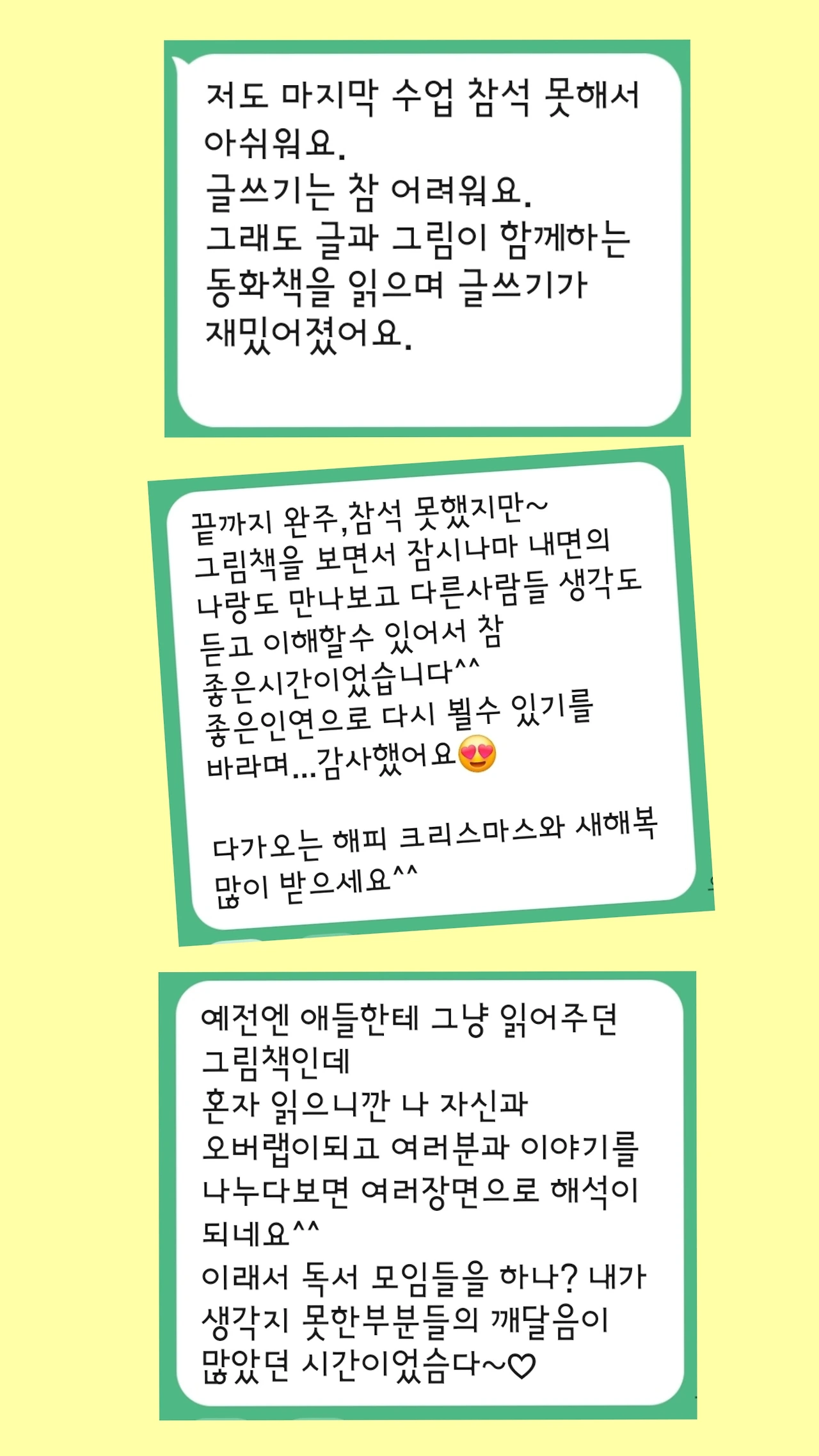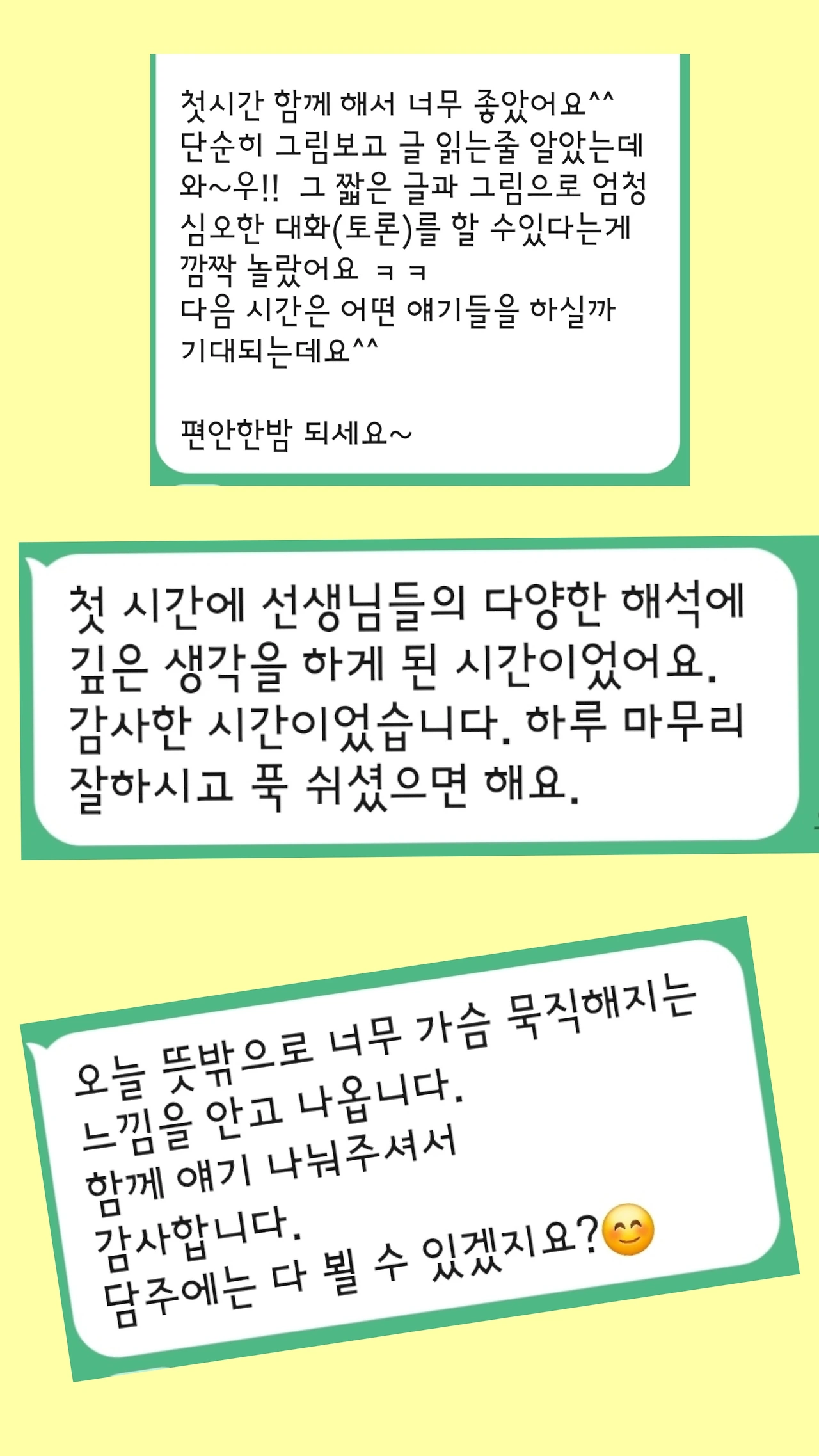 이번 클래스를 통해 그림책이 단순한 어린이 책을 넘어, 감정과 삶을 돌아보게 하는 특별한 매개체가 될 수 있다는 것을 다시 한번 확인했습니다.
