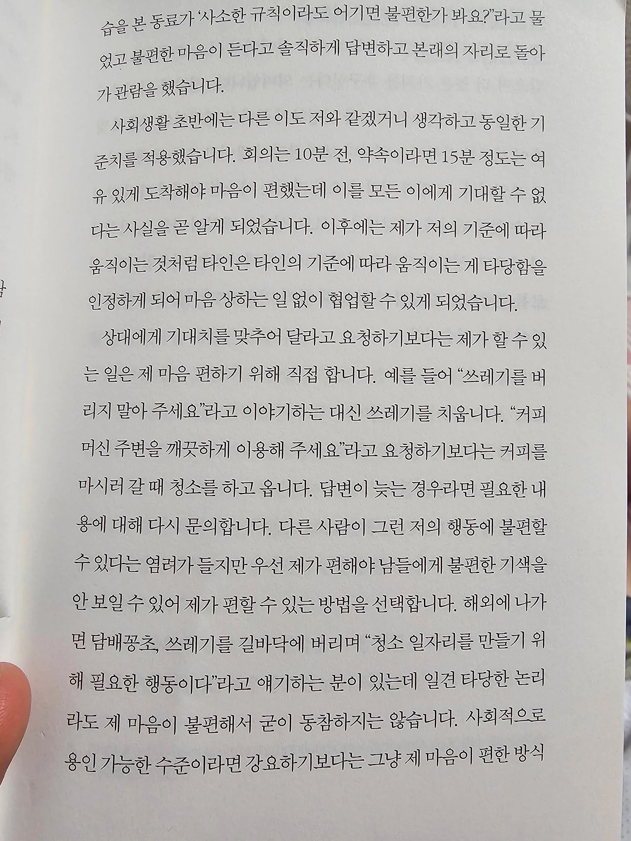 "사회생활 초반에는 다른 이도 저와 같겠거니 생각하고 동일한기 준치를 적용했습니다. 회의는 10분 전, 약속이라면 15분 정도는 여유 있게 도착해야 마음이 펀했는데 이를 모든 이에게 기대할 수 없 다는 사실을 곧알게 되었습니다. 이후에는 제가 저의 기준에 따라 움직이는 것처럼 타인은 타인의 기준에 따라 움직이는 게 타당함을 인정하게 되어 마음 상하는 일 없이 협업할 수 있게 되었습니다. 상대에게 기대치를 맞추어 달라고 요청하기보다는 제가할수 있 는 일은 제 마음 편하기 위해 직접 합니다. 예를 들어 "쓰레기를 버 리지 말아 주세요"라고 이야기하는 대신 쓰레기를 치읍니다. "커피 머신 주변을 깨끗하게 이용해 주세요"라고 요청하기보다는 커피를 마시러 갈때 청소를 하고 옵니다. 답변이 늦는 경우라면 필요한 내 용에 대해 다시 문의합니다. 다 사람이 그런 저의 행동에 불편한 수있다는 염려가들지만 우선 제가 편해야 남들에게 불편한 기색을 안보일 수 있어 제가 편할 수 있는 방법을 선택합니다."