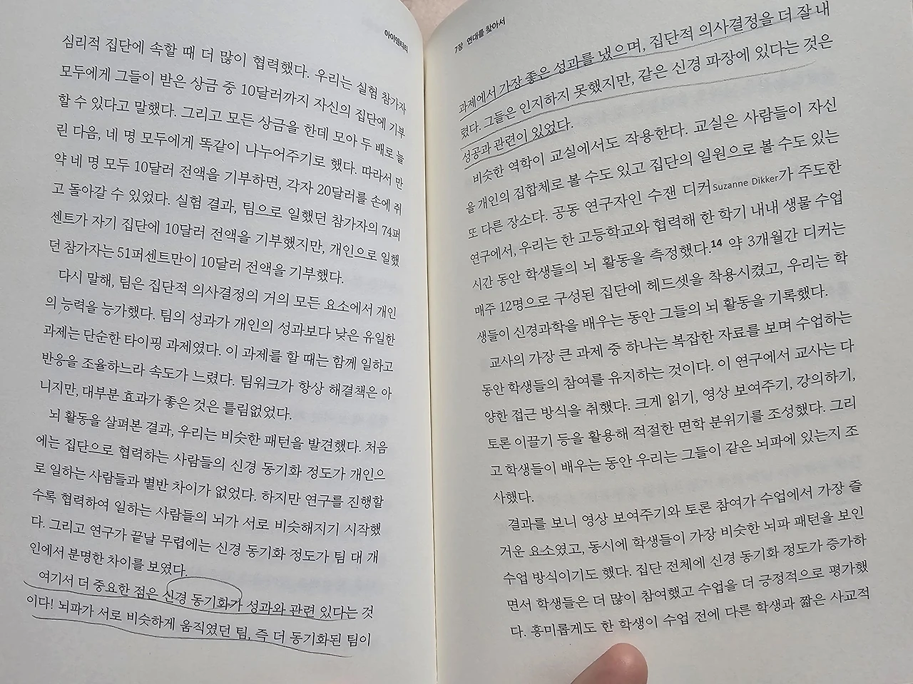 ["신경 동기화는 성과와 관련 있다. 즉, 뇌파가 서로 비슷하게 움직였던 팀, 더 동기화된 팀이 과제에서 가장 좋은 성과를 냈으며 집단의 의사결정을 더 잘 내렸다. 그들은 인지하지 못했지만 같은 신경 파장에 있다는 것은 성공과 관련이 있다._책 IDENTITY.306"]