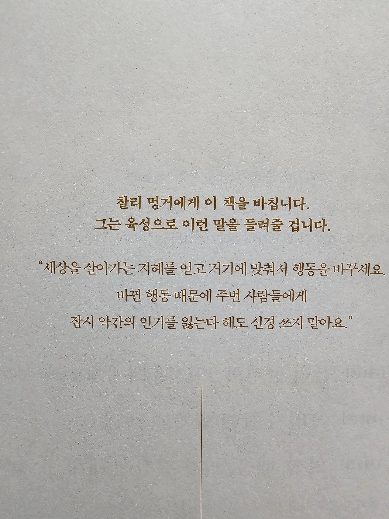 "세상을 살아가는 지혜를 얻고 거기에 맞춰서 행동을 바꾸세요. 바뀐 행동 때문에 주변 사람들에게 잠시 약간의 인기를 잃는다 해도 신경 쓰지 말아요."