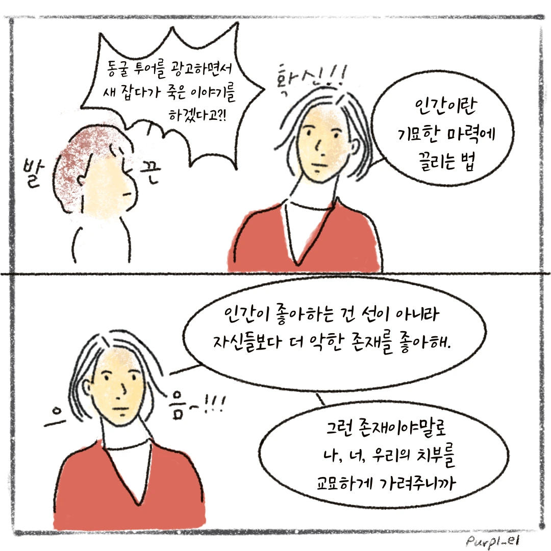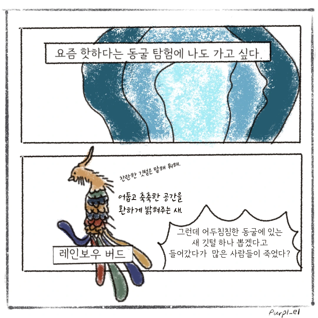 요즘 핫하다는 동굴 탐험에 나도 가고 싶다는 생각이 든다. 어둡고 축축한 공간을 환하게 밝혀주는 새. 순간적으로 환해지는 그 황홀한 느낌이라…. 찬란한 깃털은...