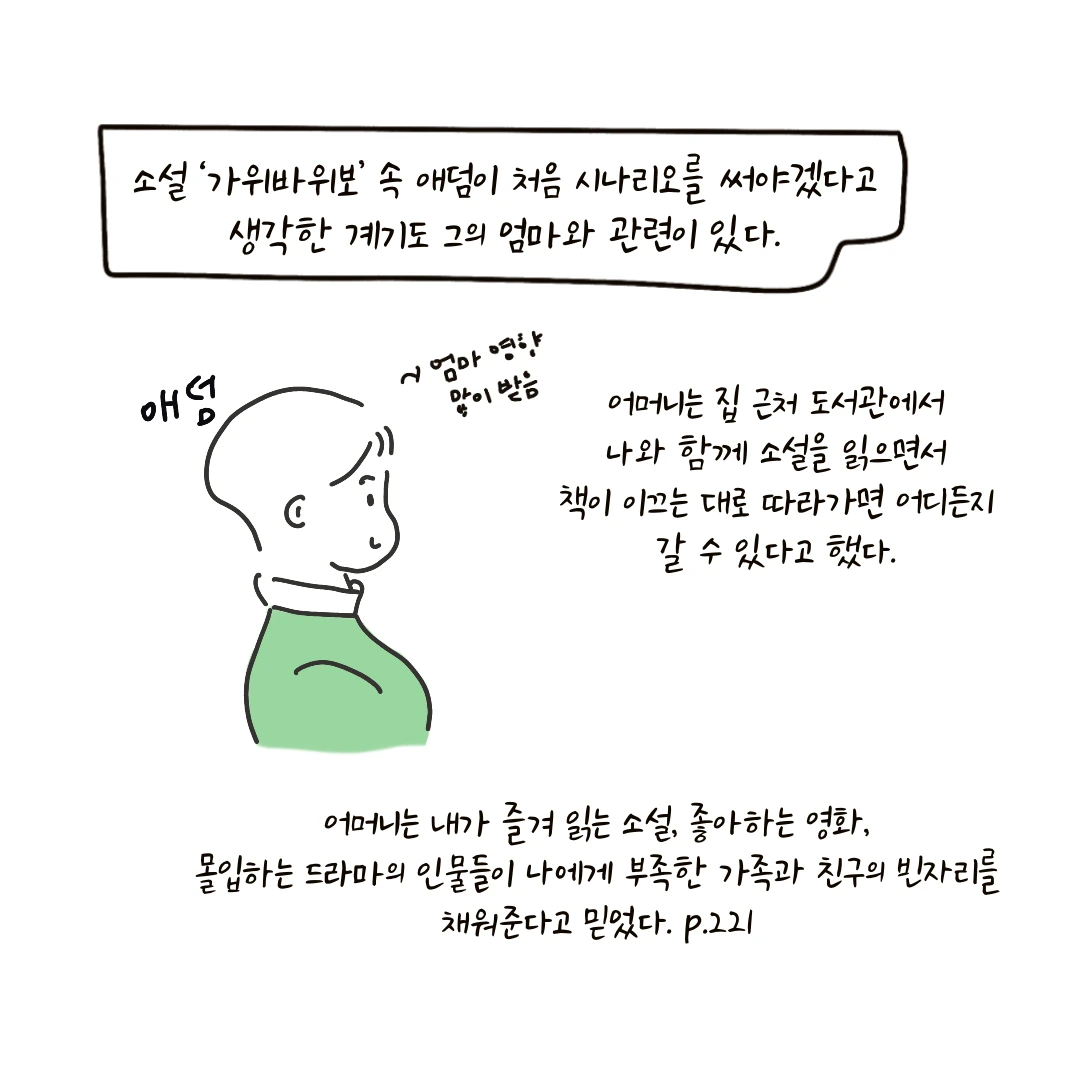 엄마라는 단어가 나오면 무조건 집중하게 되는 것 같다. 소설 ‘가위바위보’ 속 애덤이 처음 시나리오 써야겠다고 생각한 계기도 그의 엄마와 관련이 있다. 어머니는 집 근처 도서관에서 나