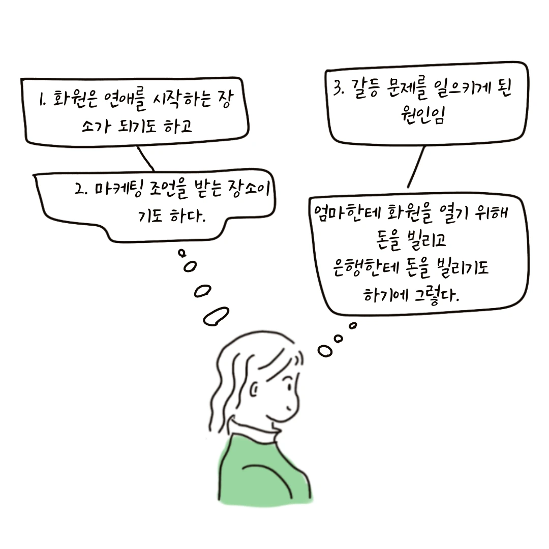 아이는 가게 안을 여기저기 돌아다녔다. 아이를 보며 화원의 주인은 '어쩌면 오늘은 하나라도 팔 수 있을지 모른다'고 생각한다. 뒤로 돌아선 화원 주인은 아이와 눈이 마주쳤다. 그녀는 붉은 점
