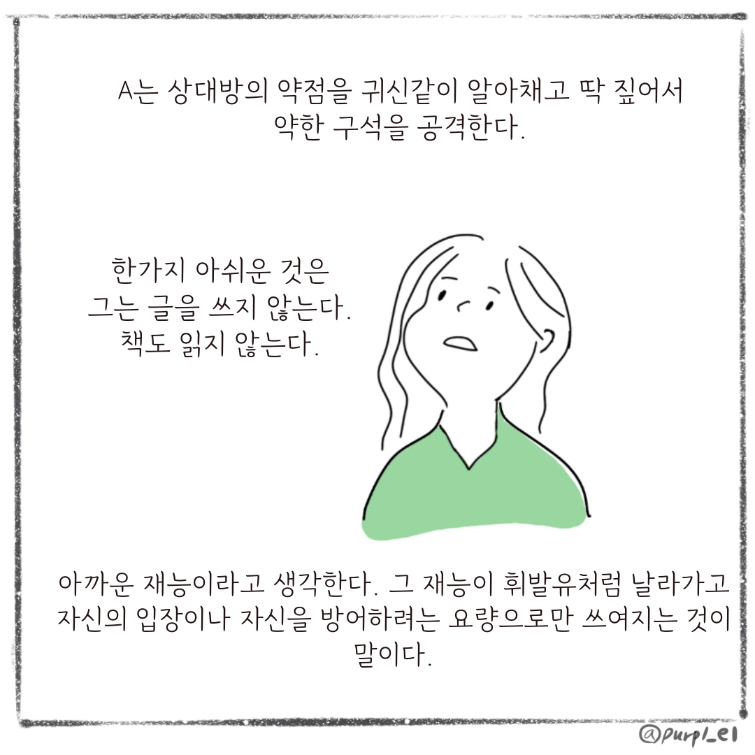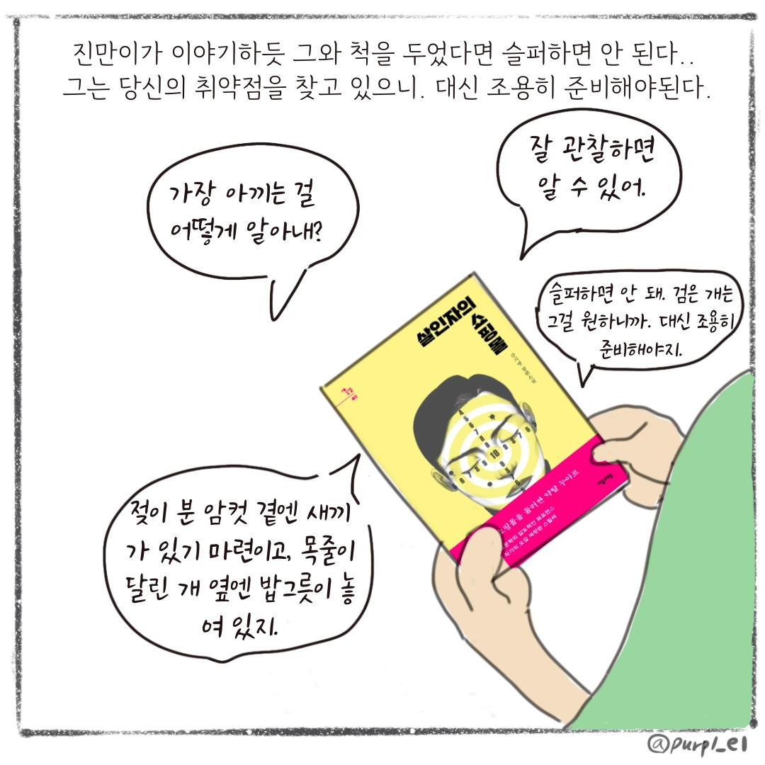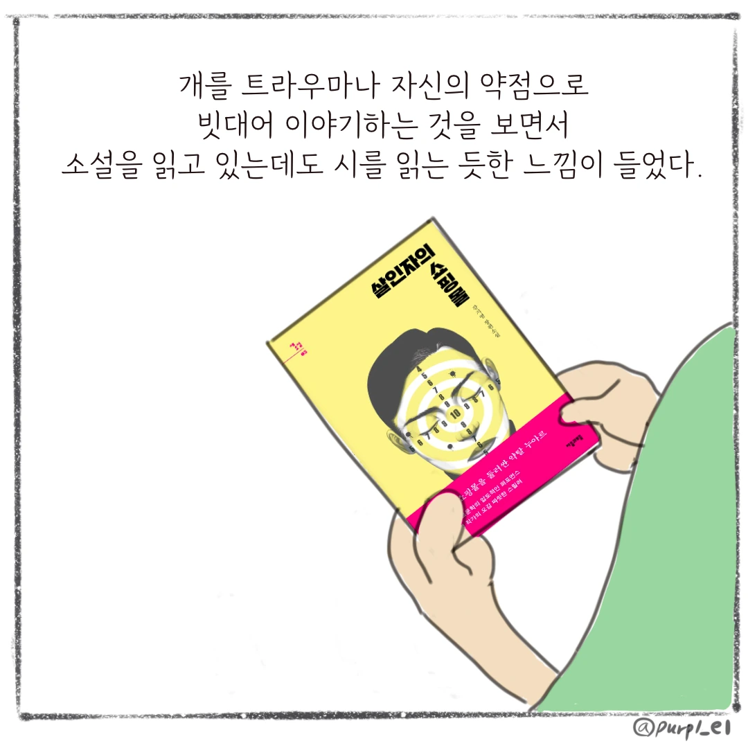 나에게 개란 무엇일까?하나의 사안에 하나의 답만 있다고 생각하는답정녀스러운 면이 나의 약점일까. 개를 트라우마나 자신의 약점으로 빗대어 이야기하는 것을 보면서소설을 읽고 있는데도