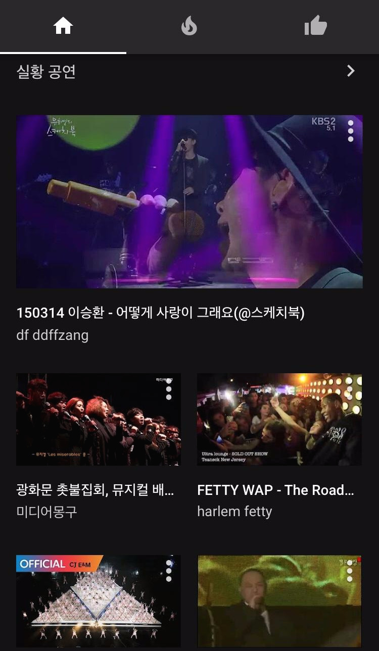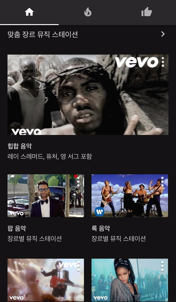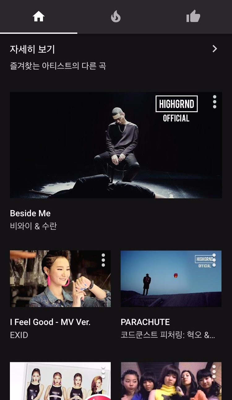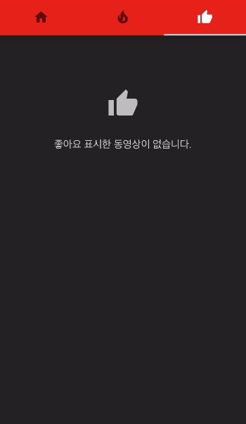 상단의 홈 아이콘의 가장 우측에 있는 좋아요를 눌러보았더니 아직 좋아요를 표시한 동영상이 없다고 나온다. 본인이 좋아요를 눌렀던 음악들을 나중에 모아 볼 수 있는 메뉴이다.