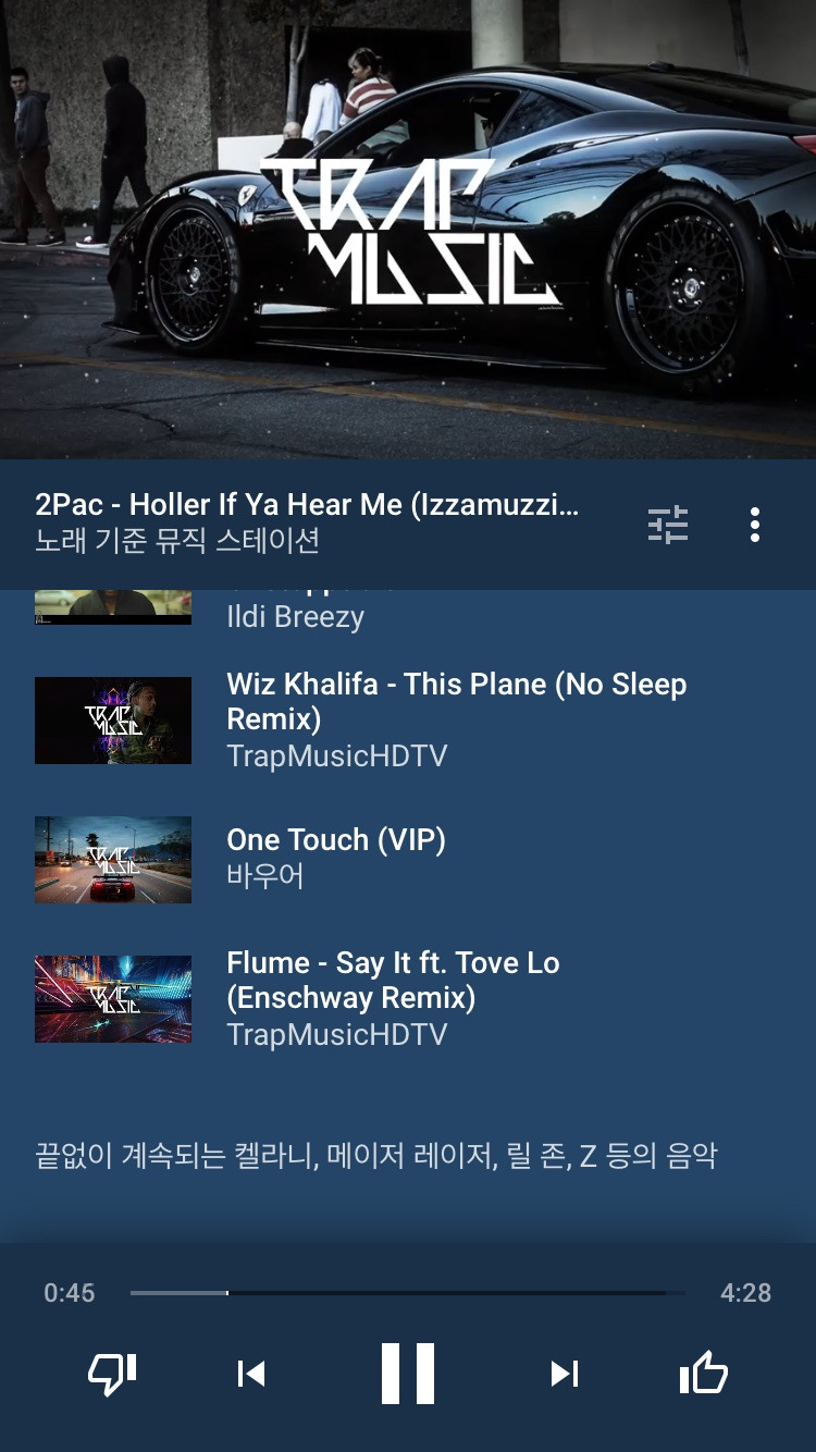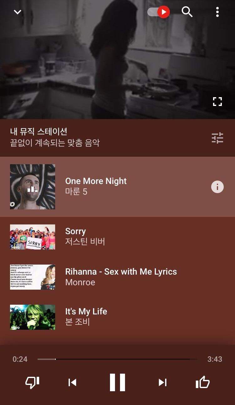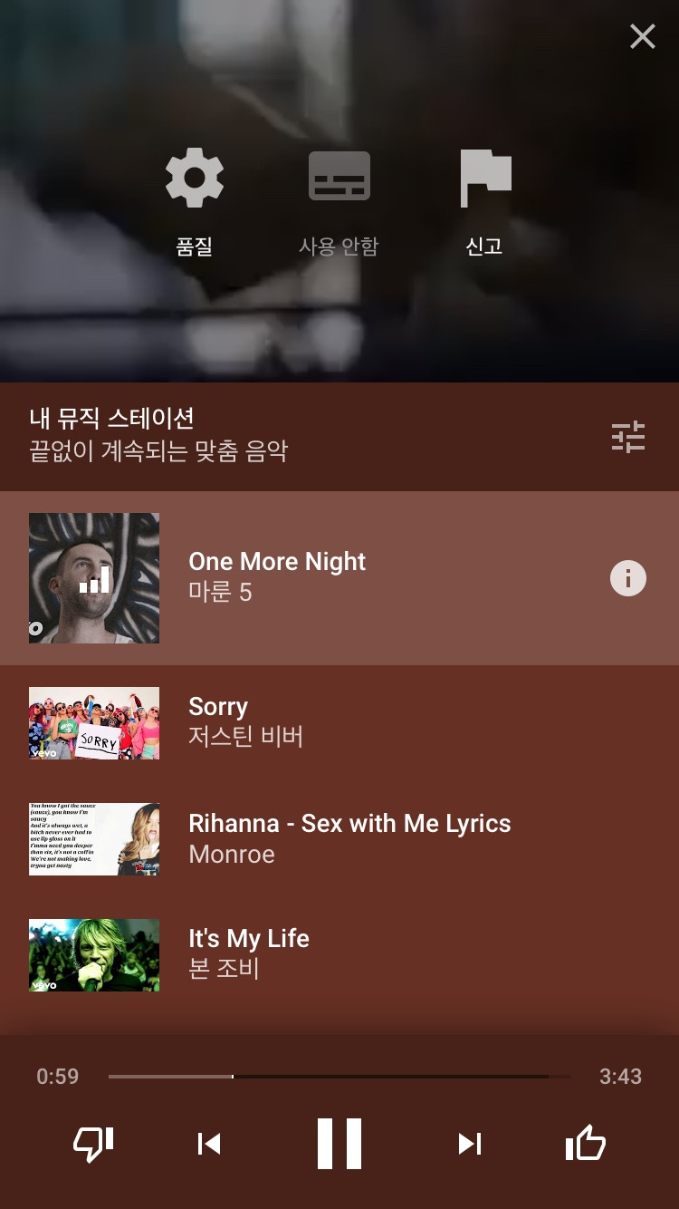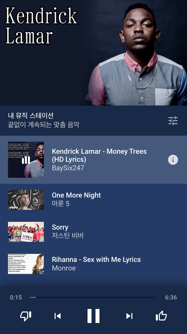 가장 하단의 양쪽 끝을 보면 좌측에는 '싫어요', 우측에는 '좋아요' 아이콘이 있다. YouTube Music이 추천해 주는 음악이 마음에 든다면 거침없이 '좋아요' 버튼을 누르고 마음에 들지 않는다면 미안할 필요 없이 '싫어요' 버튼을 누르는 것이 좋을 것이다.