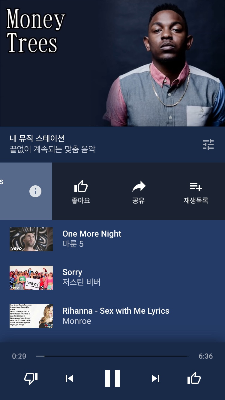 중간 이미지를 보면 현재 듣고 있는 음악에 대한 간단한 정보가 나오는데 손가락을 대고 좌측으로 밀면 좋아요를 누르거나 공유하거나 나의 재생목록에 추가할 수 있는 기능이 나타난다.