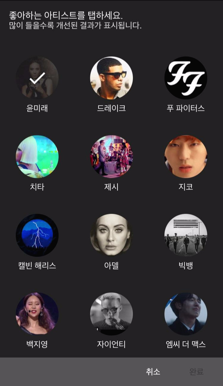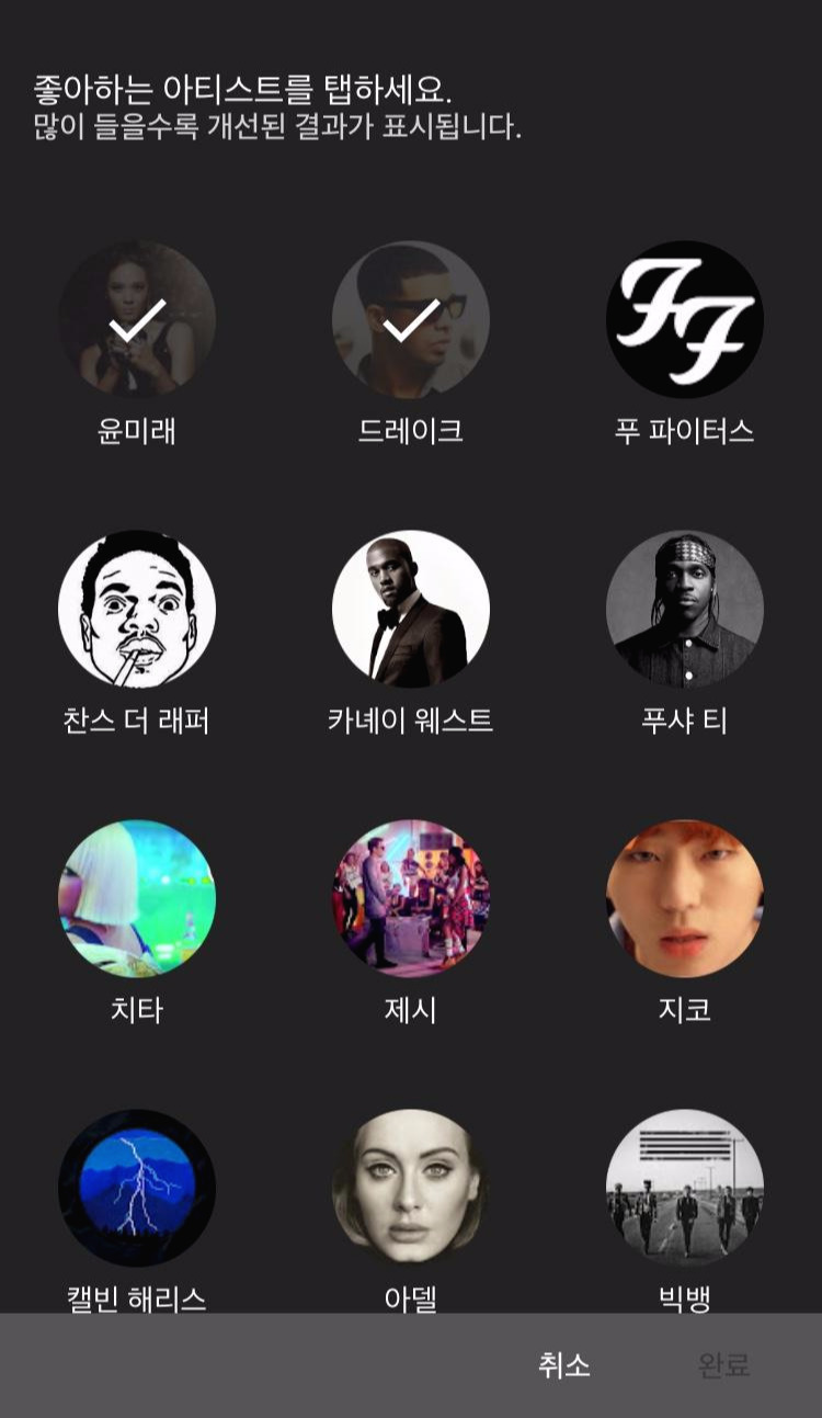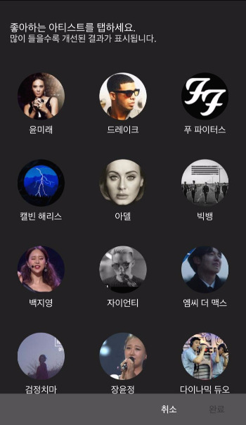 다양한 아티스트들이 나온다. 국내 아티스트 및 해외 아티스트, 그리고 R&B, POP, HIPHOP, EDM, 발라드, 인디, 트로트 등 비교적 다양한 장르의 아티스트들이 보인다. 어떤 기준으로 나오는지 잘 모르겠지만 첫 화면에 보이는 아티스트들이 다가 아니라 하단으로 스크롤을 하면 계속해서 끝도 없이 나온다.(계속 내리다 보니 끝은 있다.) 자 그럼 내가 좋아하는 아티스들을 선택해 보기로 하자.