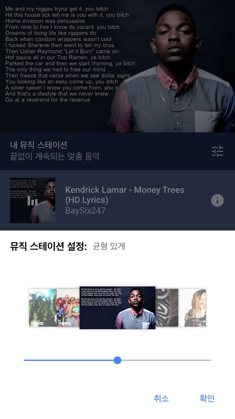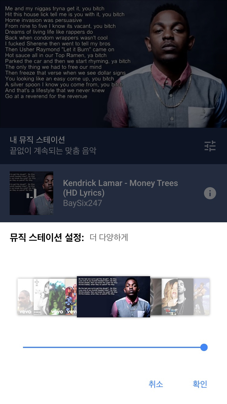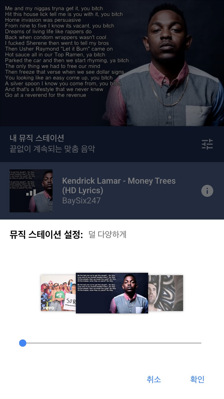 중간 바에 우측에 위치한 아이콘을 누르면 하단에 뮤직 스테이션 설정창이 나타난다. 좌측(덜 다양하게), 중간(균형 있게), 우측(더 다양하게) 3단계로 설정할 수 있어 그때그때 기분에 따라 본인이 원하는 상태로 설정할 수 있다. 물론 내 취향을 기준으로 어느 정도의 범위로 추천을 받고 싶은지를 선택하는 것이다.