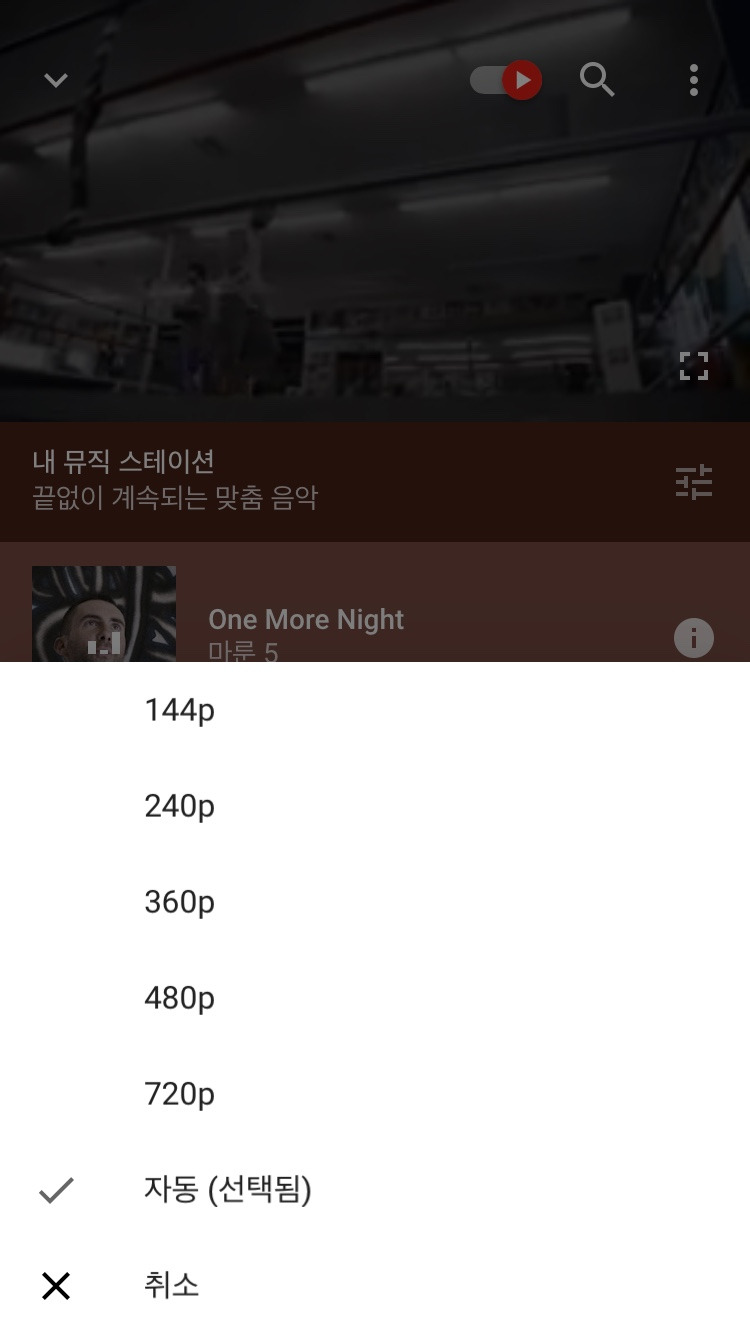 '품질' 아이콘을 클릭하면 상단 좌측 이미지와 같이 동영상의 품질을 설정할 수 있는 창이 나타난다. 일반 적으로는 어른들은 자동으로 설정해 놓겠지만 데이터 가격이 금값으로 여겨지는 어린 학생들의 경우에는 상당히 필요한 기능 일수도 있겠다는 생각이 든다.