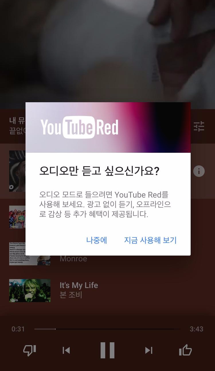 숨겨진 기능이 많다. 다 찾았는지 알았는데 더 있었다. 이왕 적은 거 친절하게 다 적어보고자 한다. 우선 현재 감상하고 있는 곡의 영상이 상단에 나오는데 영상 영역을 클릭하면 하단의 좌측 이미지에서 보이듣 숨겨져 있던 아이콘이 몇 개 나타난다. 붉은색 원에 플레이 버튼을 클릭하면 하단의 중간 이미지에 보이듯 YouTube Red 가입을 권유하는 메시지가 뜬다.