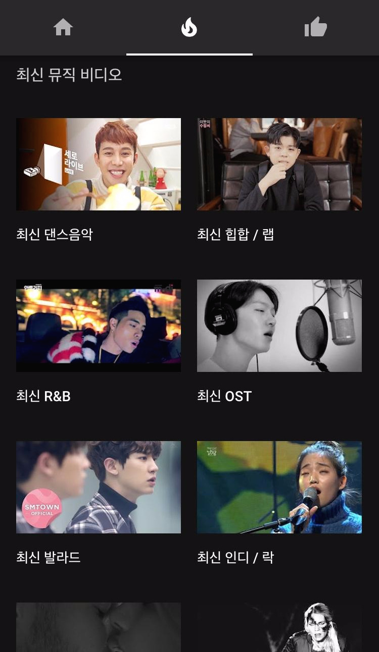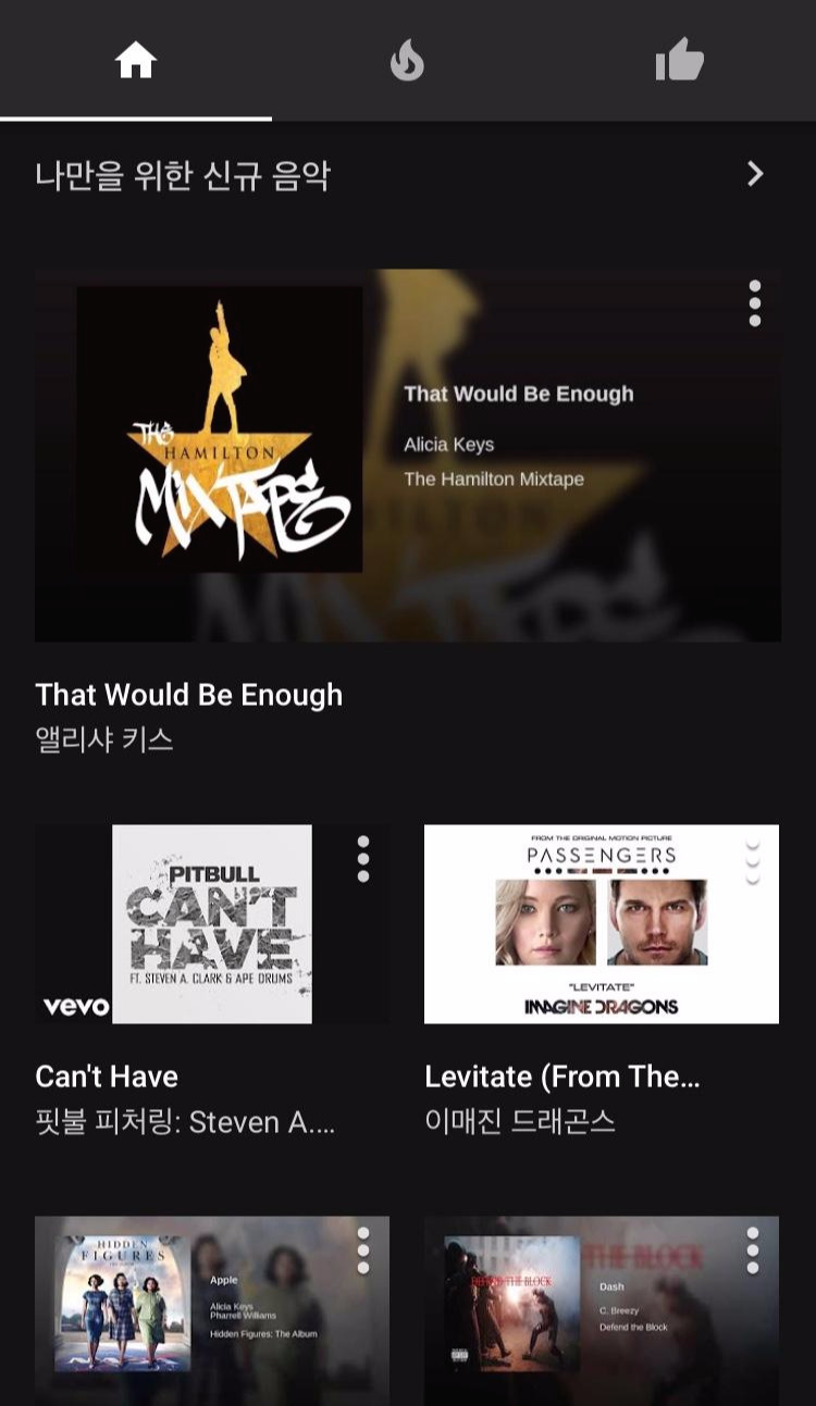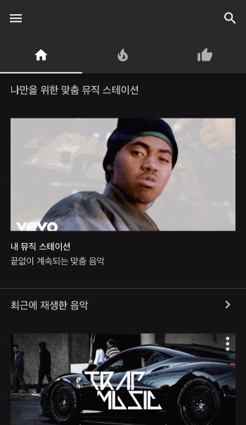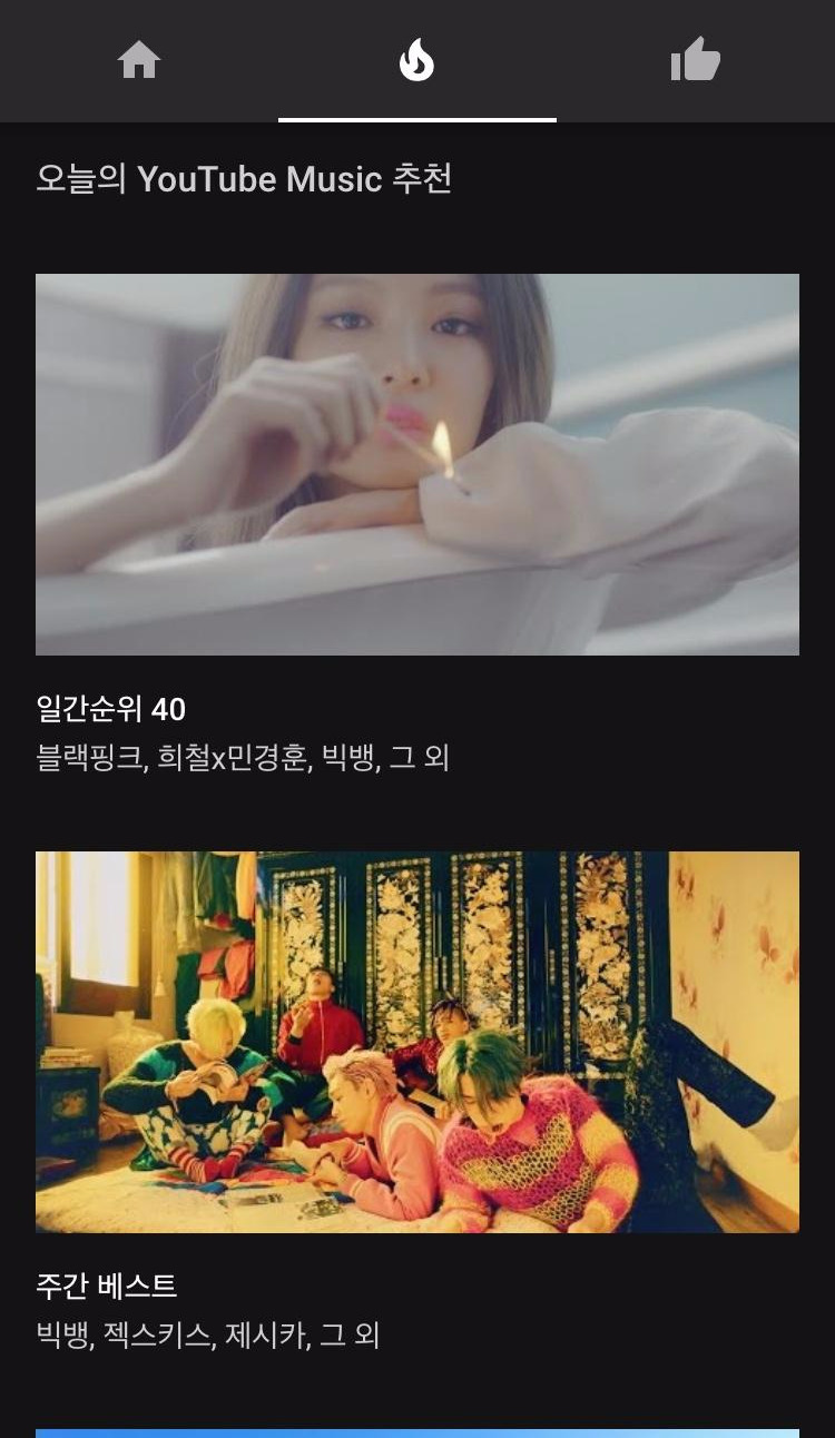 아래 보이는 이미지 상단의 홈 아이콘 우측이자 중간에 있는 불 아이콘 섹션으로 넘어가 보겠다. 최신 음악, 최신 뮤직비디오, 오늘의 YouTube Music 추천, 일간 순위 40, 주간 베스트 등의 카테고리가 보인다. 최신 뮤직비디오 같은 경우는 다양한 장르별로 구분이 되어 있으며 일간 순위는 순위대로가 아닌 40곡이 랜덤으로 재생되며 접속할 때 같은 곡 순서가 또 안보이도록 매일 바뀐다고 한다.