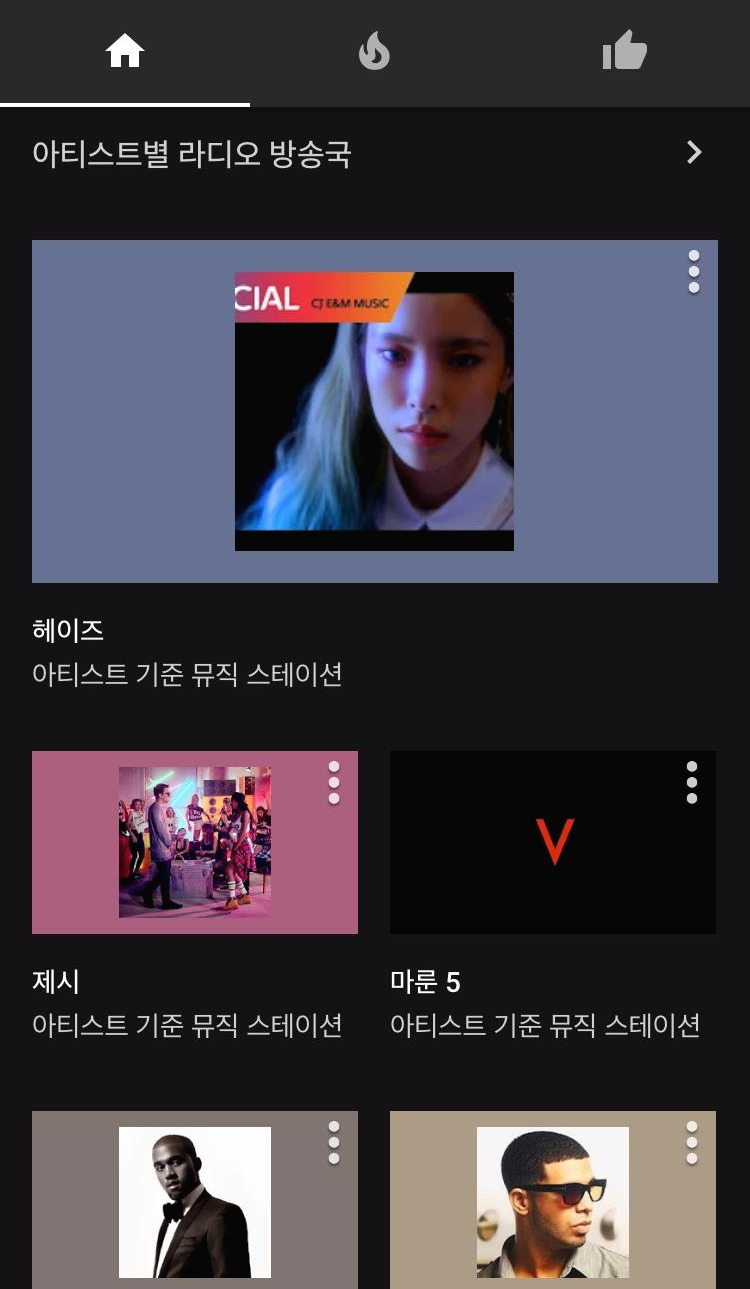 좋아하는 아티스트를 선택해 내 뮤직스테이션이 설정되었다. 그러면 하단에는 어떠한 것들이 더 있는지 스크롤을 내려 보았다. 나만을 위한 신규 음악, 맞춤 장르 뮤직 스테이션, 즐겨 찾는 아티스트의 다른 곡, 아티스트별 라디오 방송국, 실황 공연, 맞춤 동영상 등의 카테고리가 나타난다. 재밌는 것은 접속할 때마다 이 카테고리들의 순서가 랜덤 하게 바뀌는 것 같다.