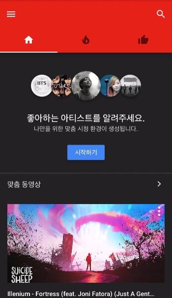 이는 그동안 전혀 원하지 않던 곡들이 도배하여 개인의 취향을 무시했던 기존의 음원 서비스 플랫폼들과 달리 본인이 듣고 싶던 음악을 검색해야 했던 불편함을 많이 덜어줄 수 있을 듯하다. 홈 화면 옆에는 불 아이콘과 좋아요 아이콘이 보인다. 이 카테고리는 뒤에서 알아보기로 하고 우선 내가 좋아하는 아티스트들을 알려주기 위해 '시작하기'를 눌러보자.