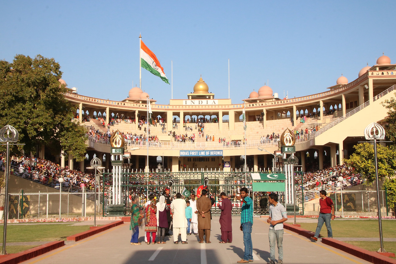 # 파키스탄에서 바라본 인도의 와가보더 풍경. 파키스탄과 인도 사이의 국경인 와가보더는 매일 저녁 국경을 사이에 두고 양국이 경쟁하듯 벌이는 국기하강식으로 유명한 곳이다. 와가보더를 통해 국경을 넘을 예정이라면, 양쪽에서 열리는 국기하강식을 모두 참석하고 비교해 보는 것도 또 다른 재미이다.