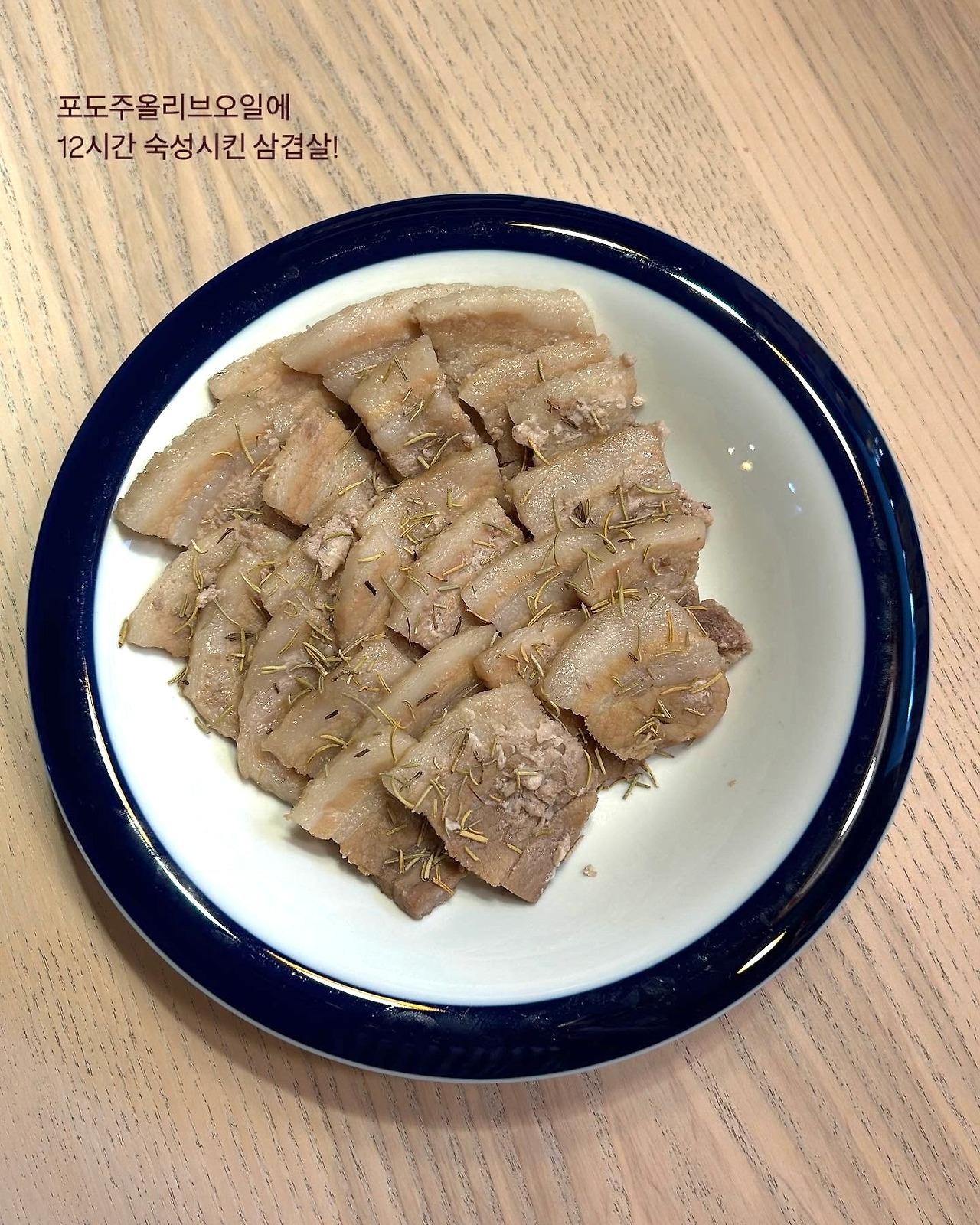 이렇게 고기를 찌듯이 구우면 약간 수육 느낌이 나기도 하는데 센 불에 바짝 구운 고기랑은 맛이 완전히 다르다. 물론 센 불에 바짝 구운 고기 식감을 훨씬 더 좋아하는 사람도 있을 것이다. 하지만 이 고기를 그렇게 구웠다면 와인향은 다 날아가고 핑크빛을 품은 삼겹살보다는 그냥 센 불에 구운 삼겹살에 더 가까웠을지도 모른다.