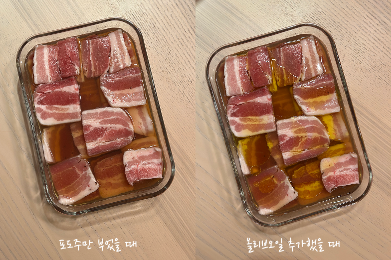 2. 고기가 잠길 만큼 포도주를 먼저 부운 후, 추가로 올리브오일을 밥수저 기준으로 2 수저 넣는다. 랩을 씌워 뚜껑을 덮고 확실하게 밀폐가 된 상태로 냉장실에 넣어 12시간 정도 숙성시킨다. 만약에 12시간 숙성하기에 시간이 부족하면 최소 4시간 이상 숙성시키는 것을 추천한다.